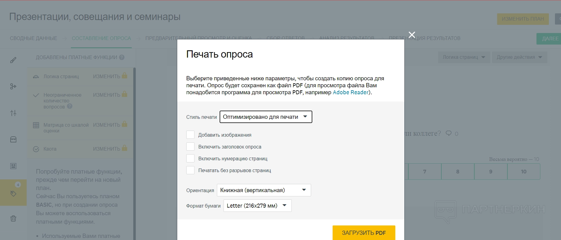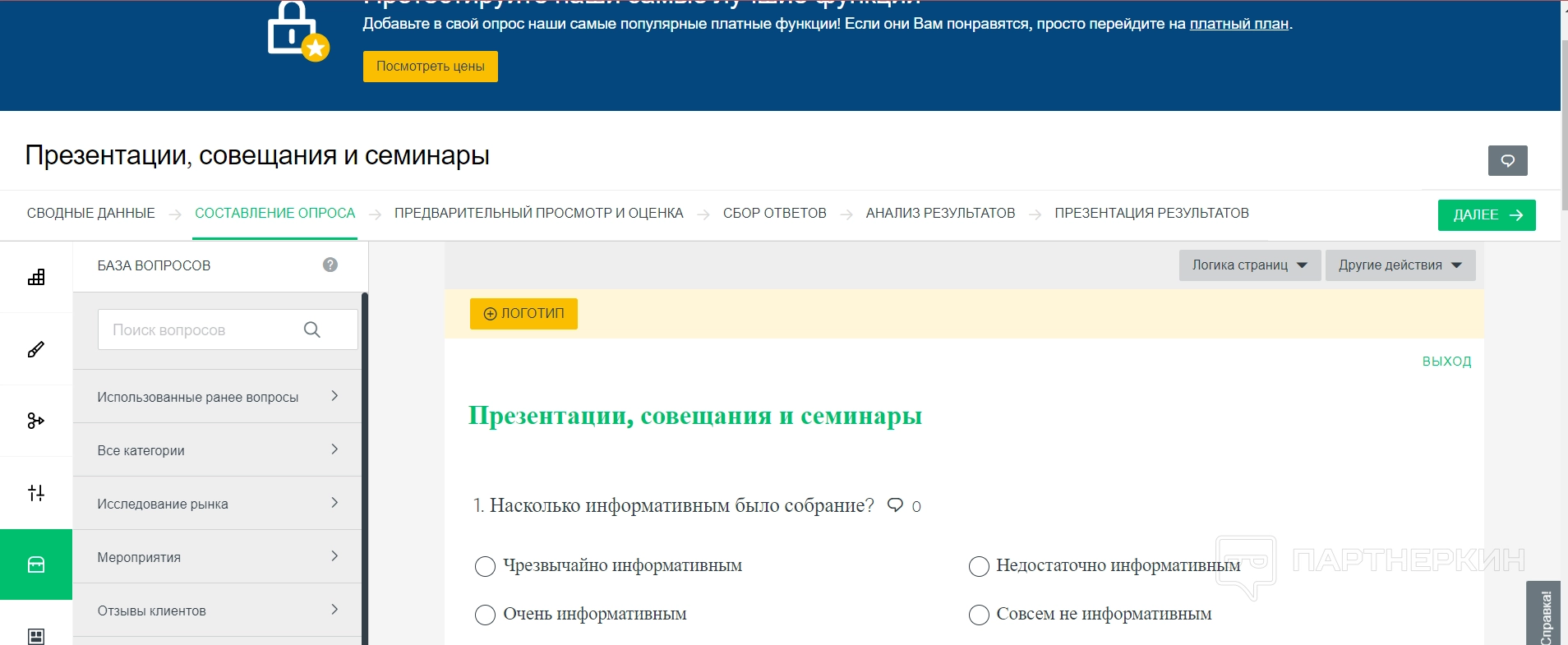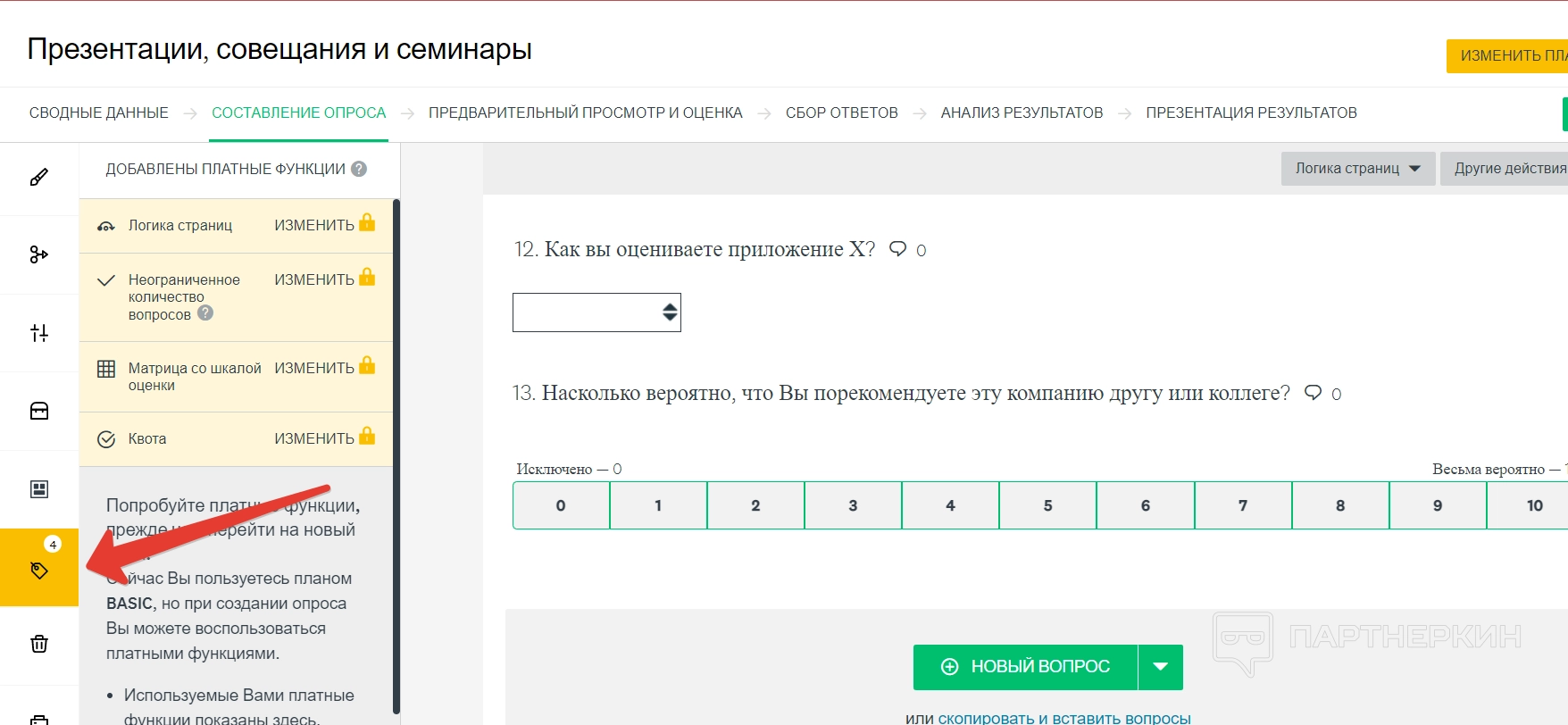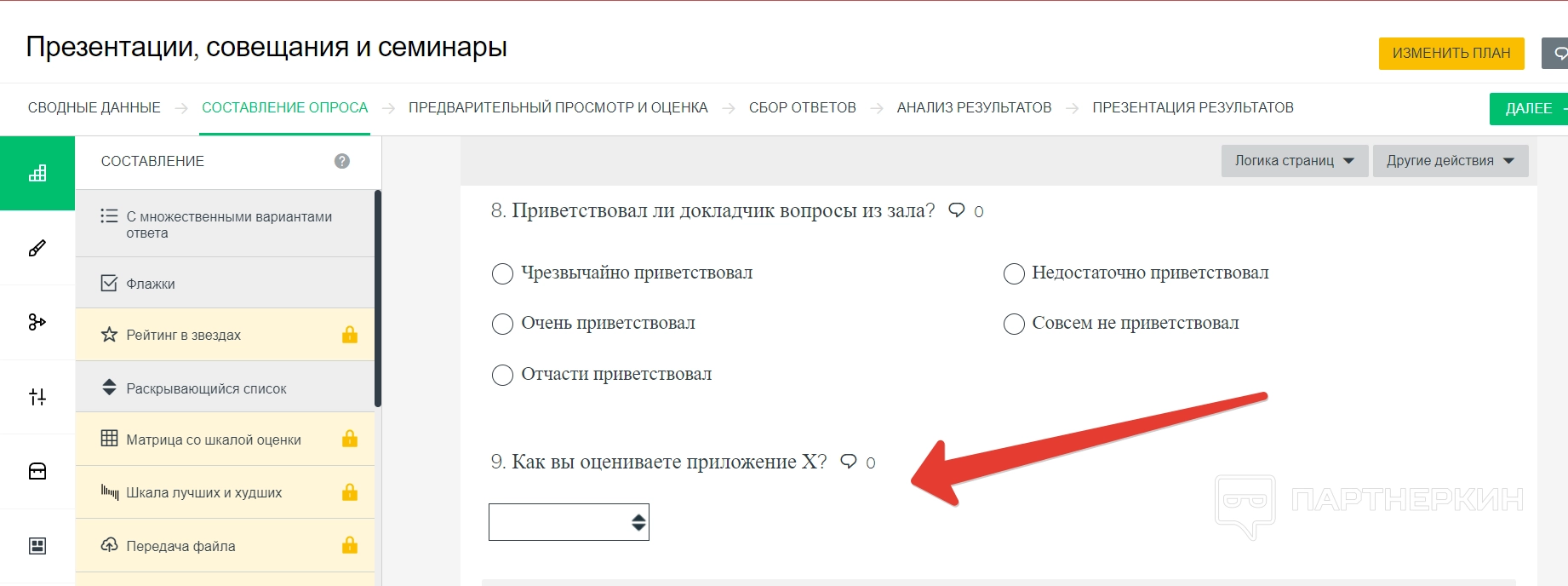 В этом разделе представлен весь список платных функций, которые пользователь применял в своем опросе. Сервис дает их возможность добавить, но при публикации этих вопросов попросит обновить свой план, чтобы они стали доступны. Поэтому при базовой подписке важно обращать внимание на эти фичи — они отмечены розоватым цветом и замком рядом.