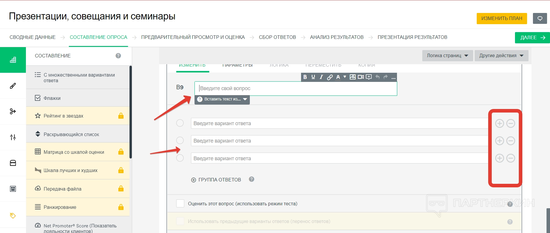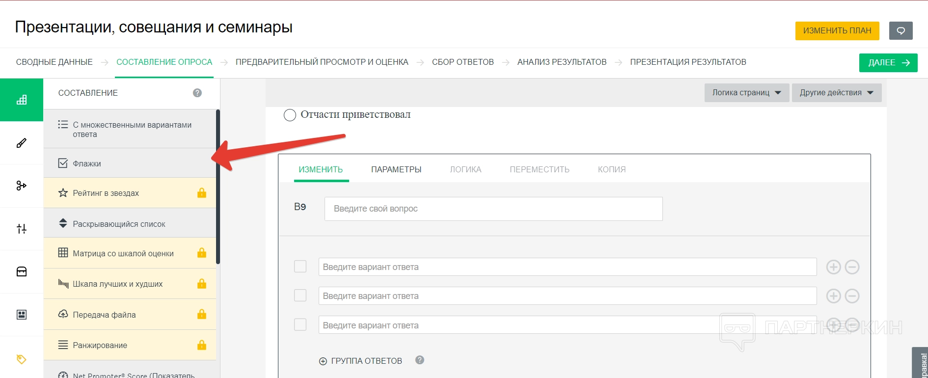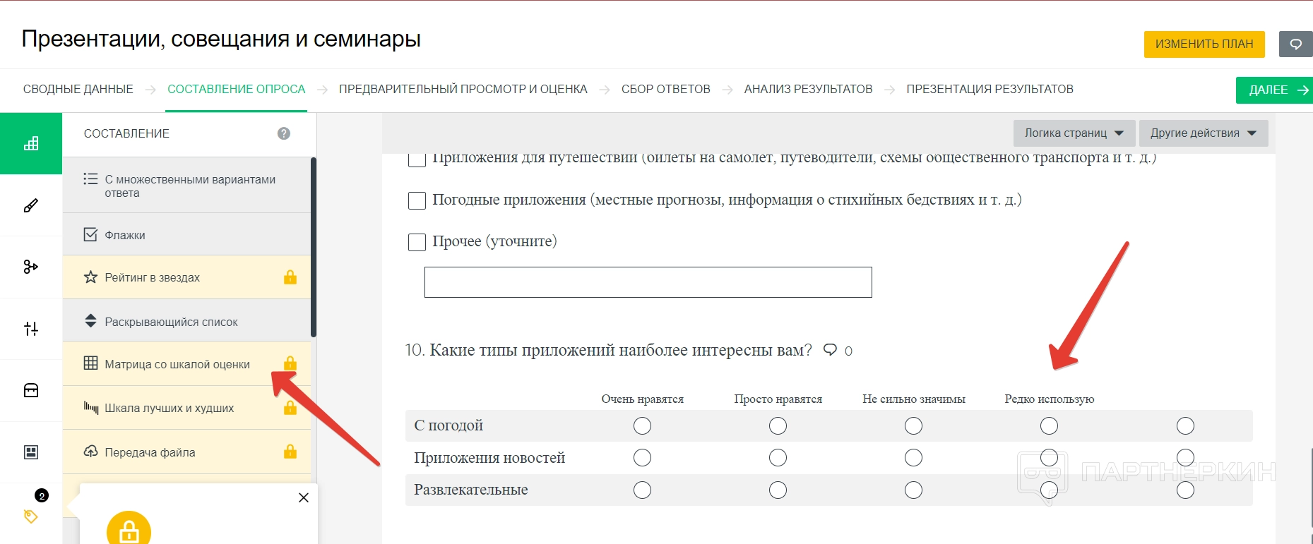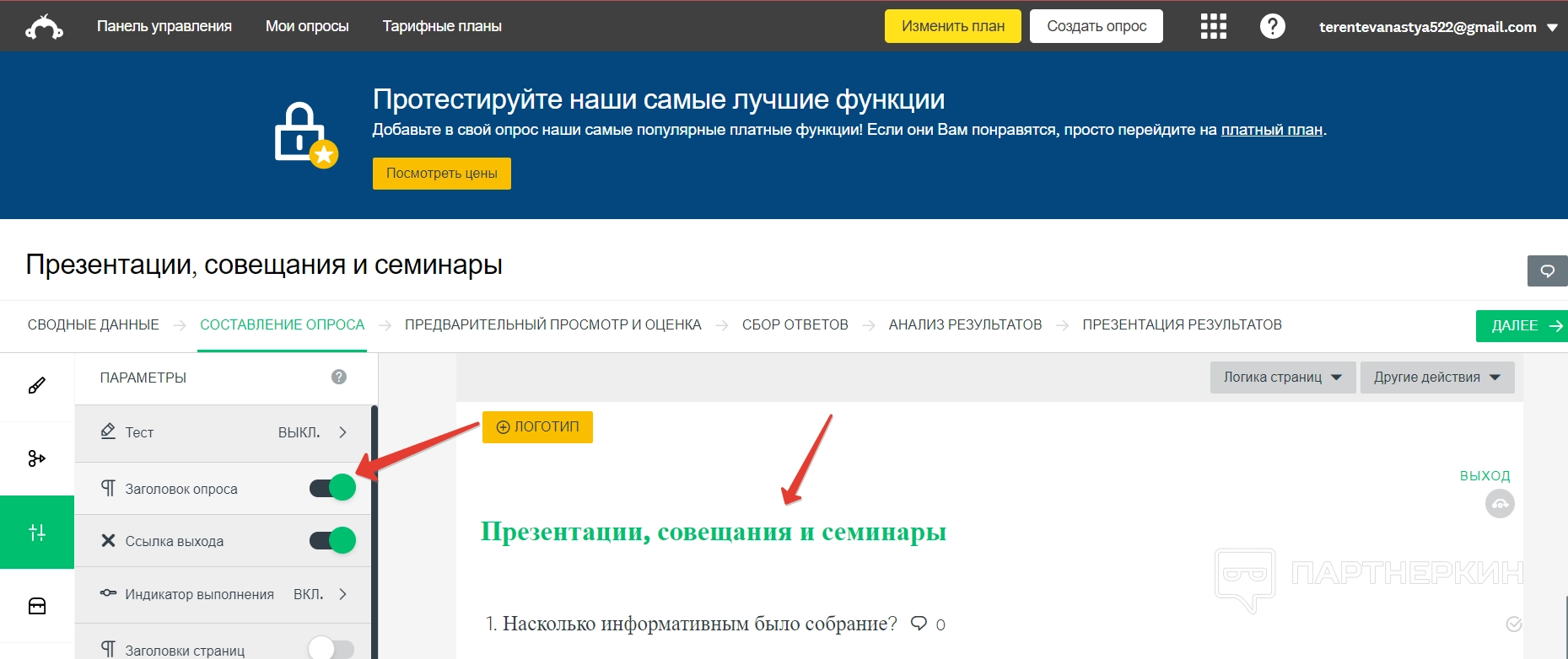 В этом разделе представлен весь список платных функций, которые пользователь применял в своем опросе. Сервис дает их возможность добавить, но при публикации этих вопросов попросит обновить свой план, чтобы они стали доступны. Поэтому при базовой подписке важно обращать внимание на эти фичи — они отмечены розоватым цветом и замком рядом.