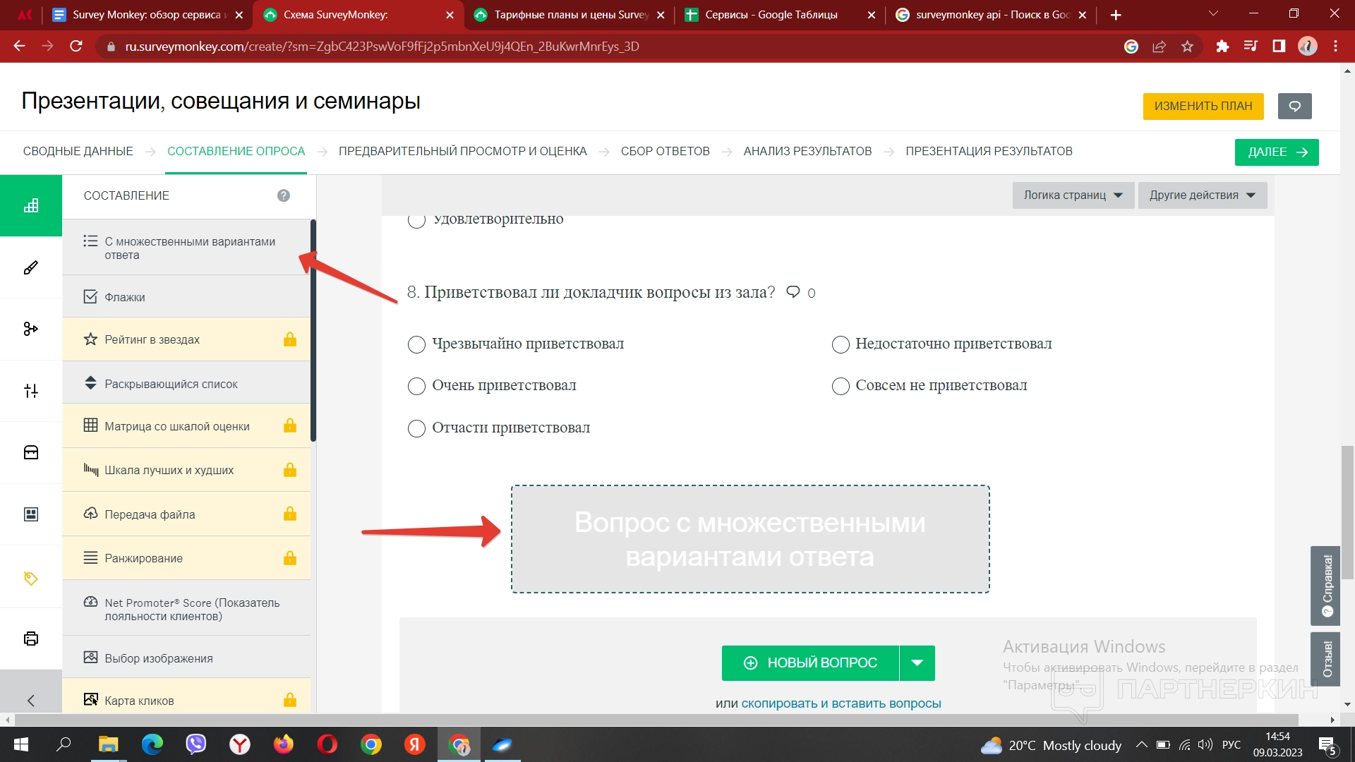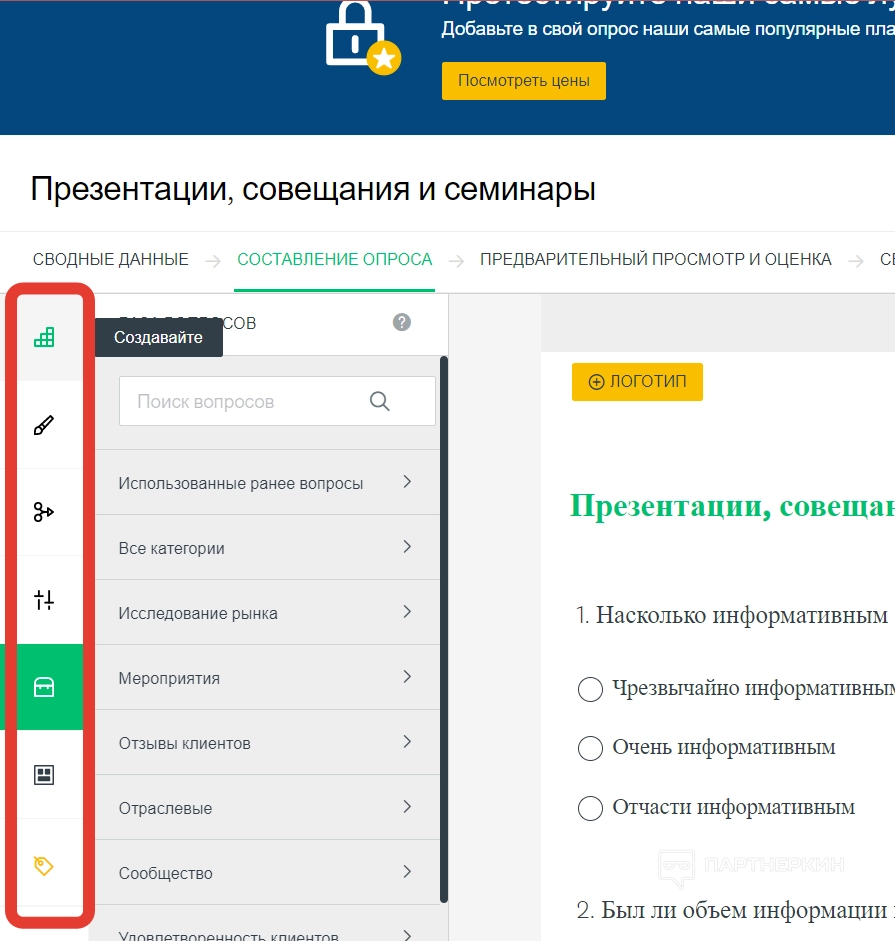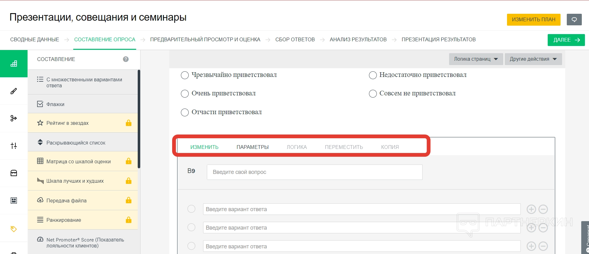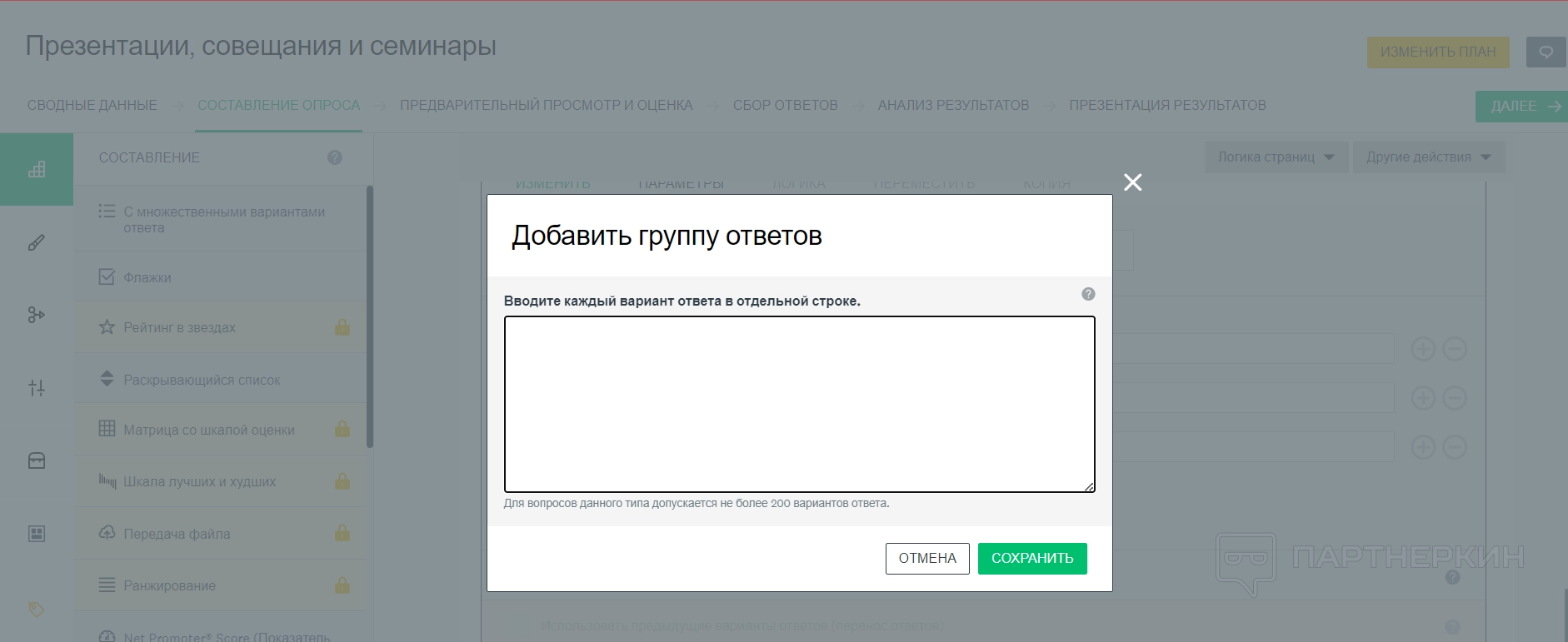 В этом разделе представлен весь список платных функций, которые пользователь применял в своем опросе. Сервис дает их возможность добавить, но при публикации этих вопросов попросит обновить свой план, чтобы они стали доступны. Поэтому при базовой подписке важно обращать внимание на эти фичи — они отмечены розоватым цветом и замком рядом.