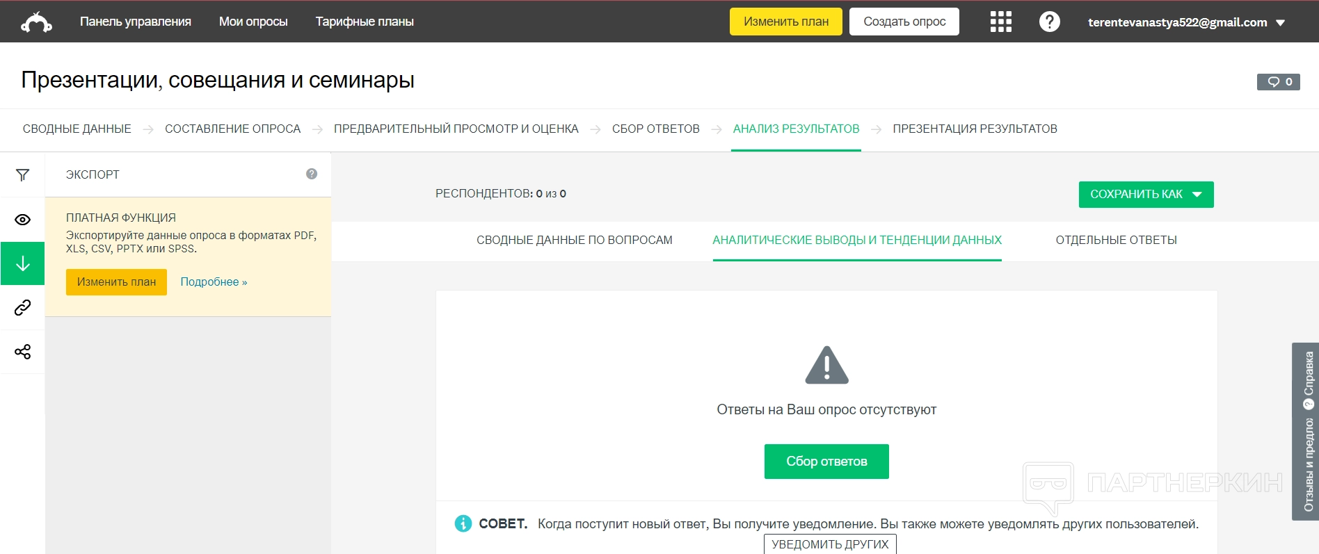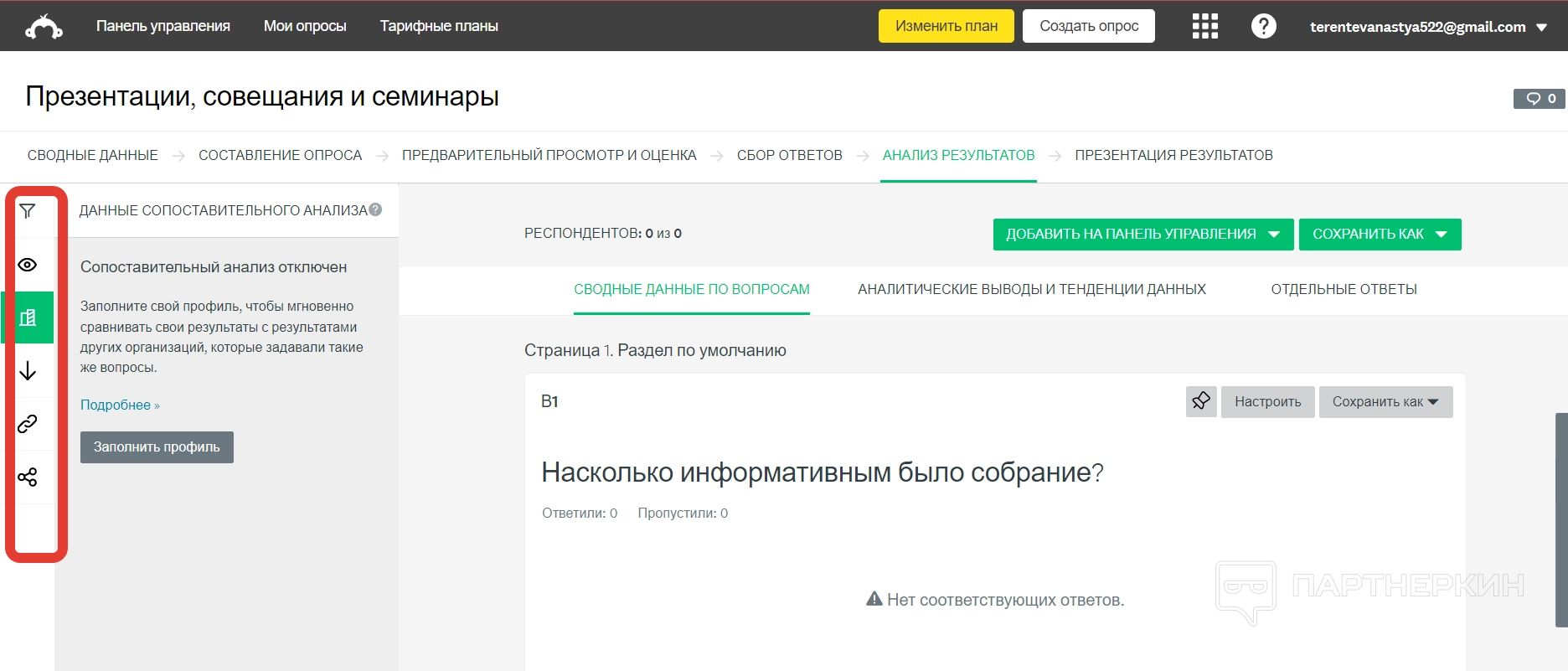 Анализ результатов — в этом разделе происходит настройка результатов опроса, а также отображаются все данные в трех разных категориях: сводные данные по вопросам, аналитические выводы и тенденции данных, отдельные ответы.