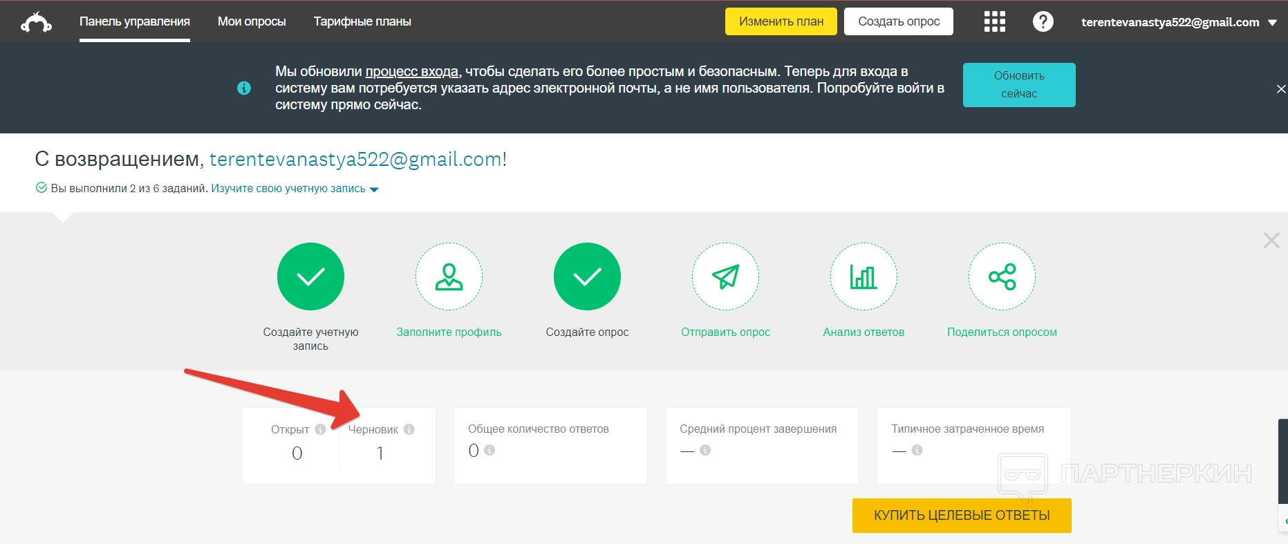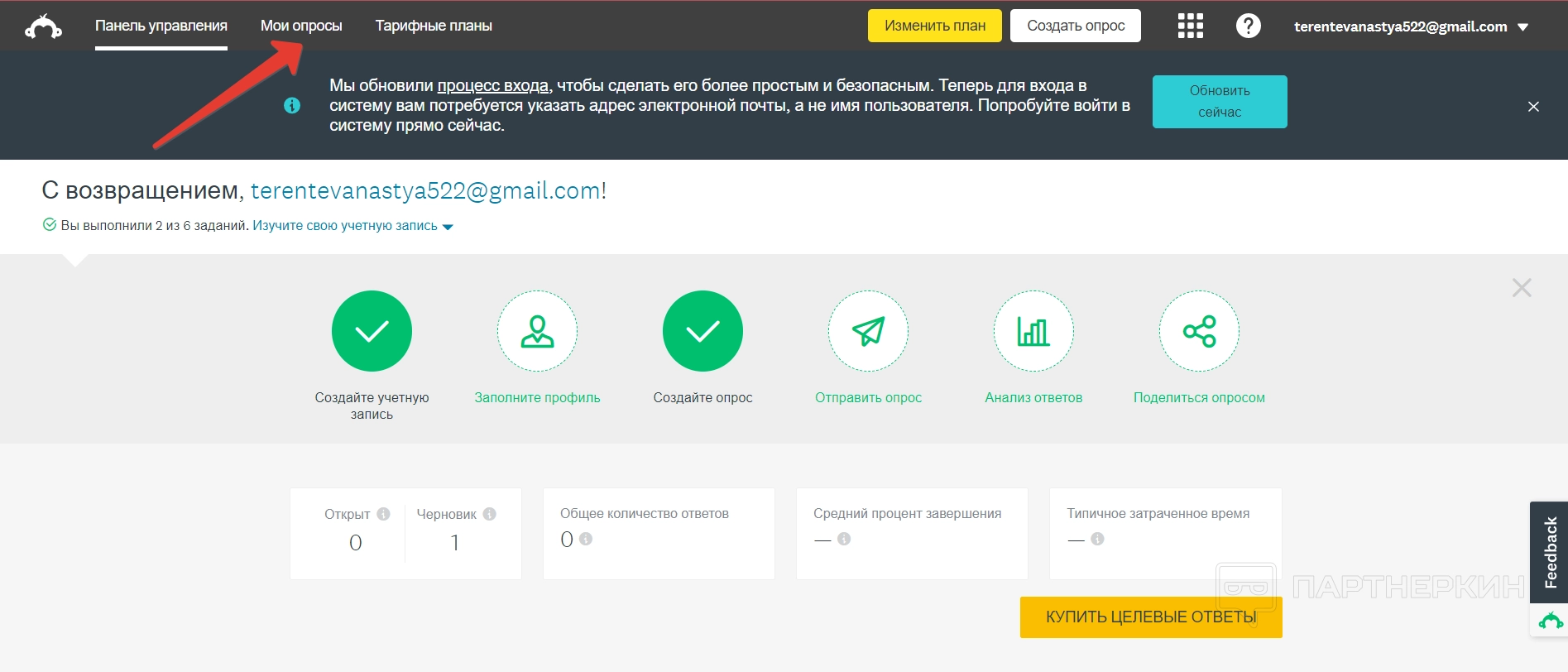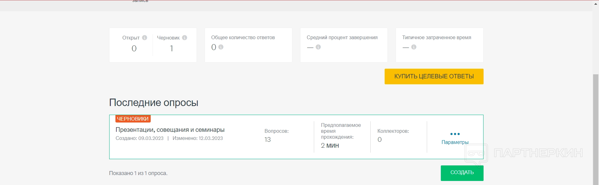 Если перейти в панель управления, то там отображаются сводные данные по опросам — есть список готовых, а также черновики.