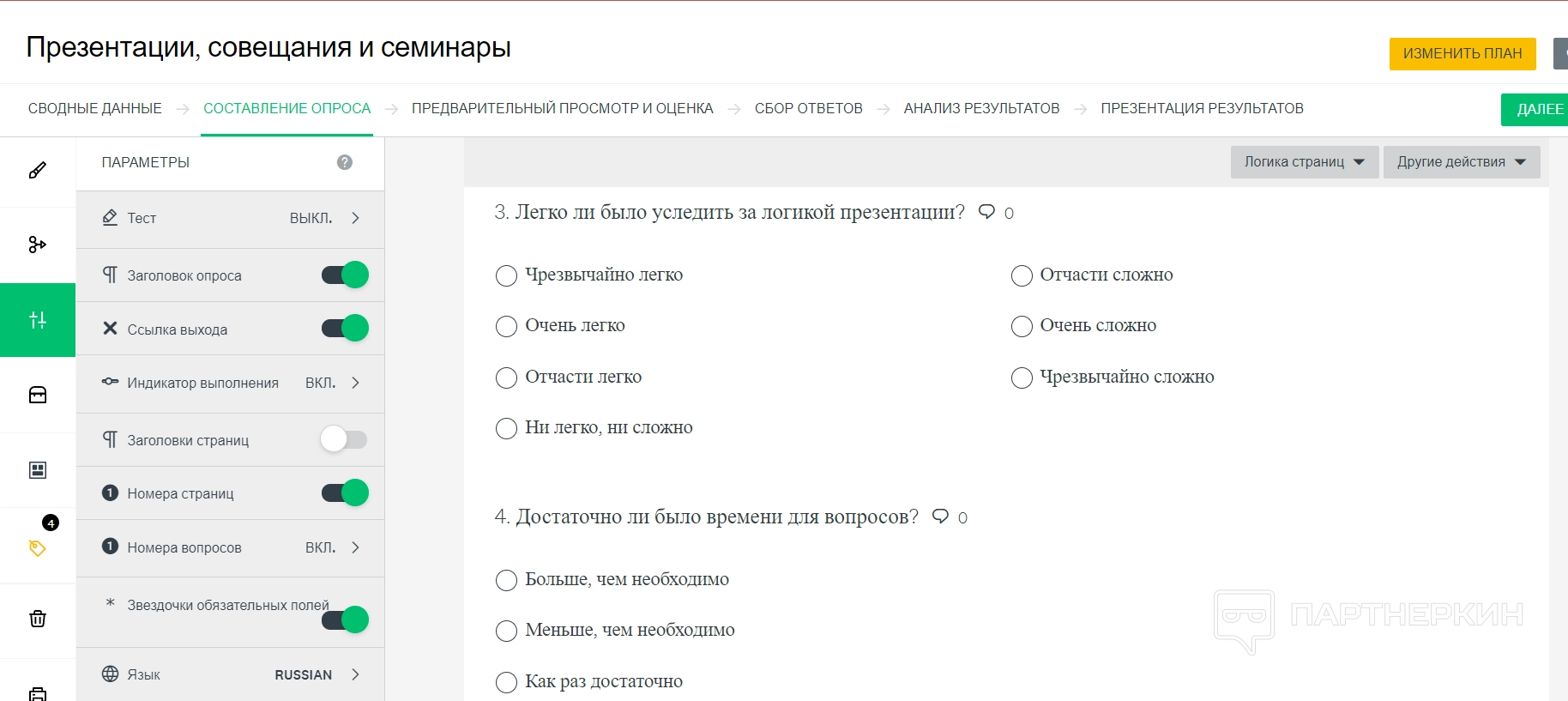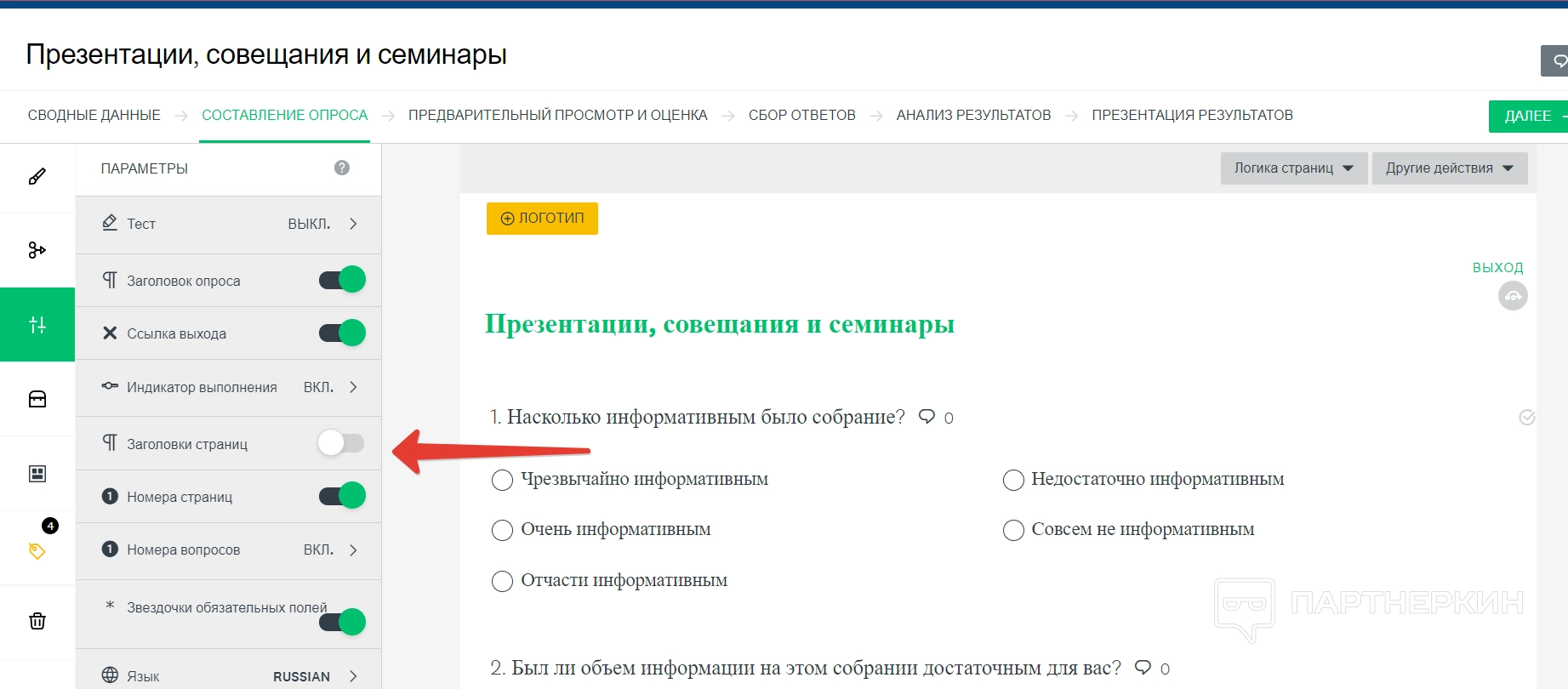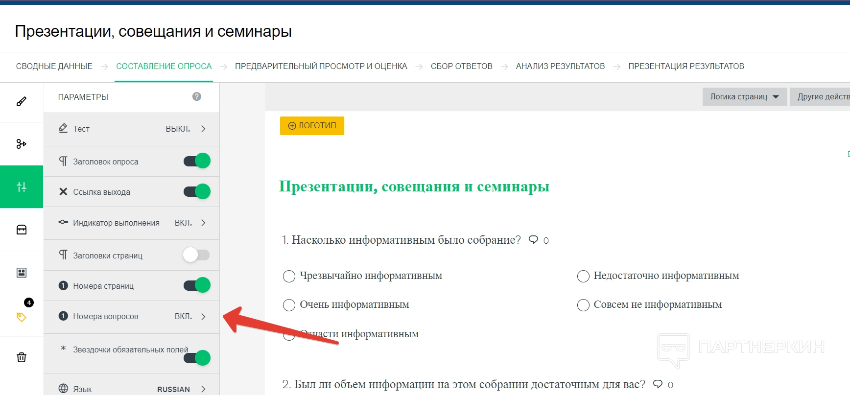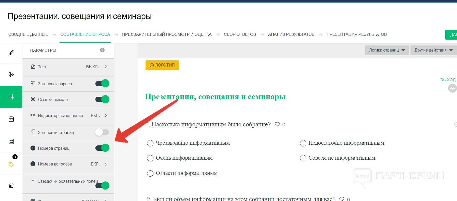 Номера страниц — тут уже отмечается, будут ли респонденты видеть номера страниц или нет.