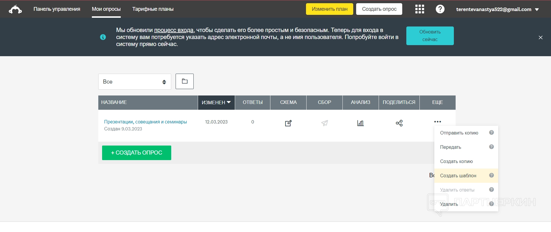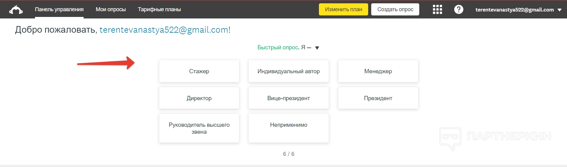 Перед началом работы с сервисом необходимо пройти регистрацию — достаточно авторизоваться по почте, и сразу после этого пользователь попадает в рабочее пространство для создания опросов. Если не оплачивать тариф, можно остаться на базовом функционале — тогда в день можно делать до 10 опросов.