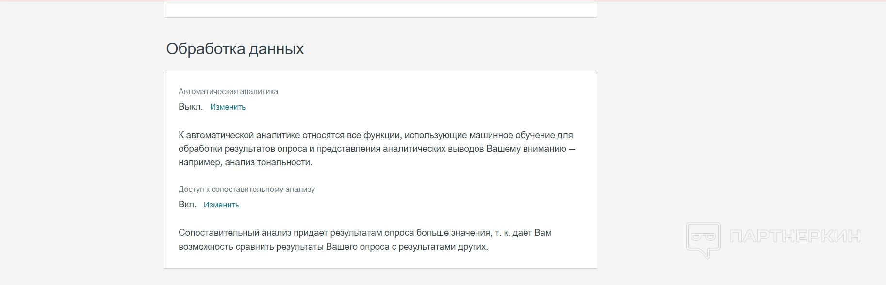 Далее есть обработка данных, где можно активировать автоматическую аналитику всех данных опроса, а также предоставить доступ к сопоставительному анализу на платформе.