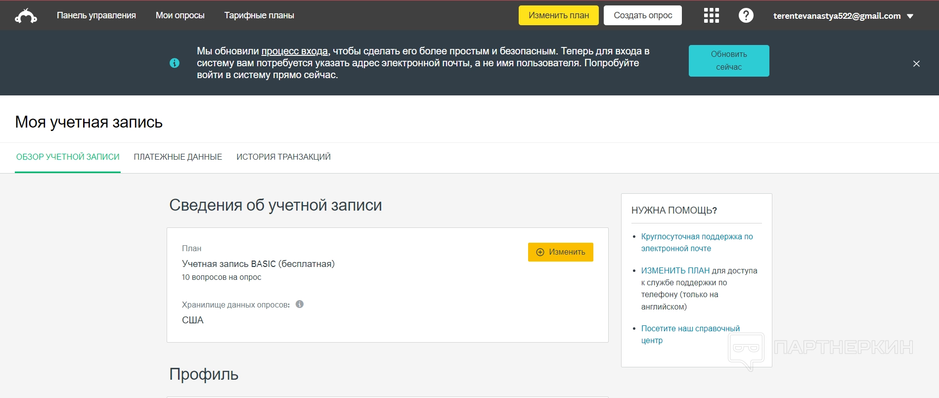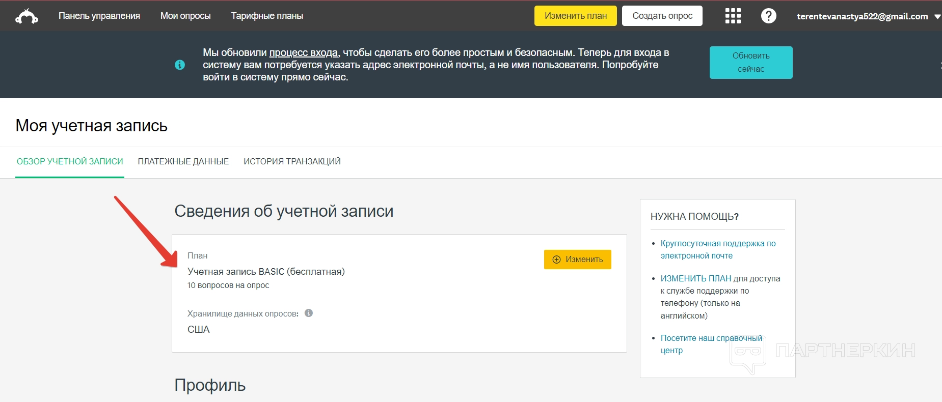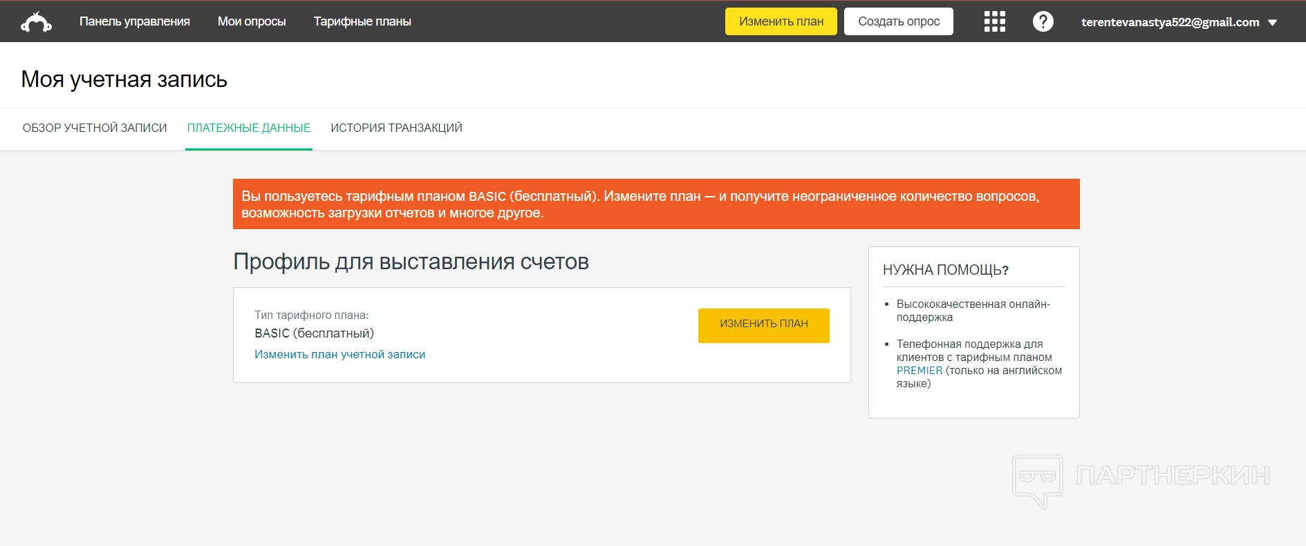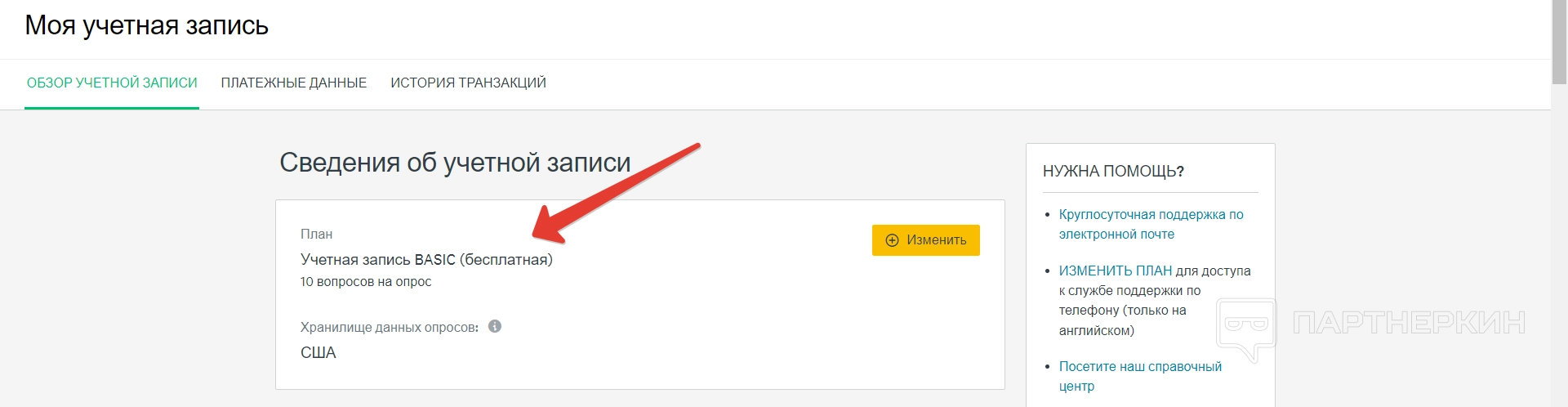 Обзор учетной записи — в этом меню показывается, какой тариф у пользователя, и где хранятся все данные его опросов. По необходимости, тариф можно сменить через это меню.