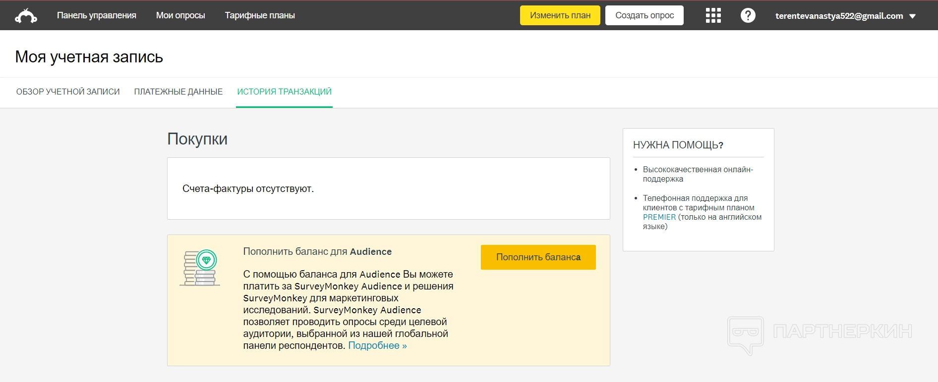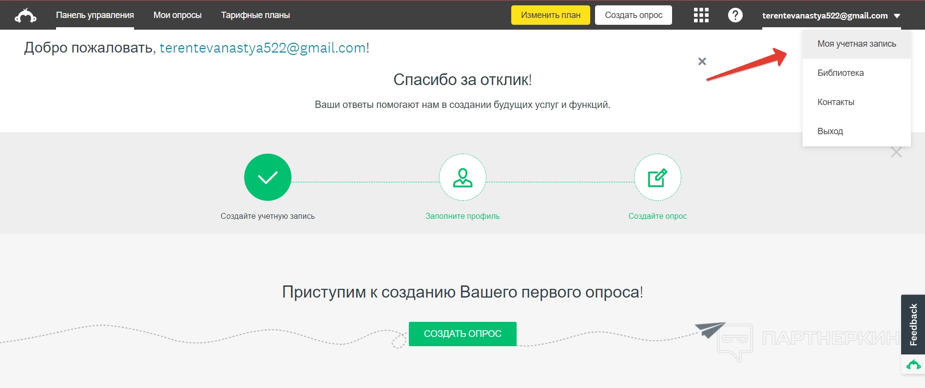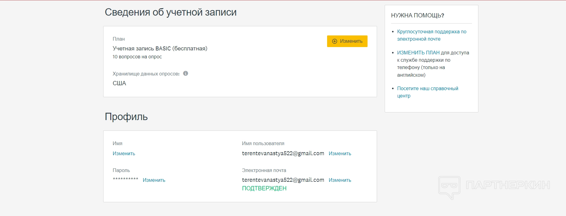 Обзор учетной записи — в этом меню показывается, какой тариф у пользователя, и где хранятся все данные его опросов. По необходимости, тариф можно сменить через это меню.