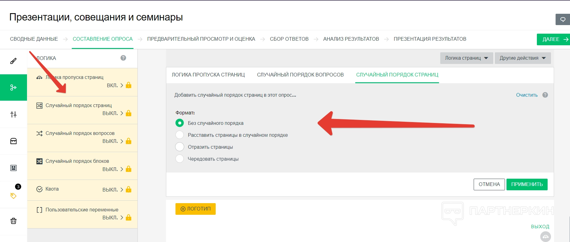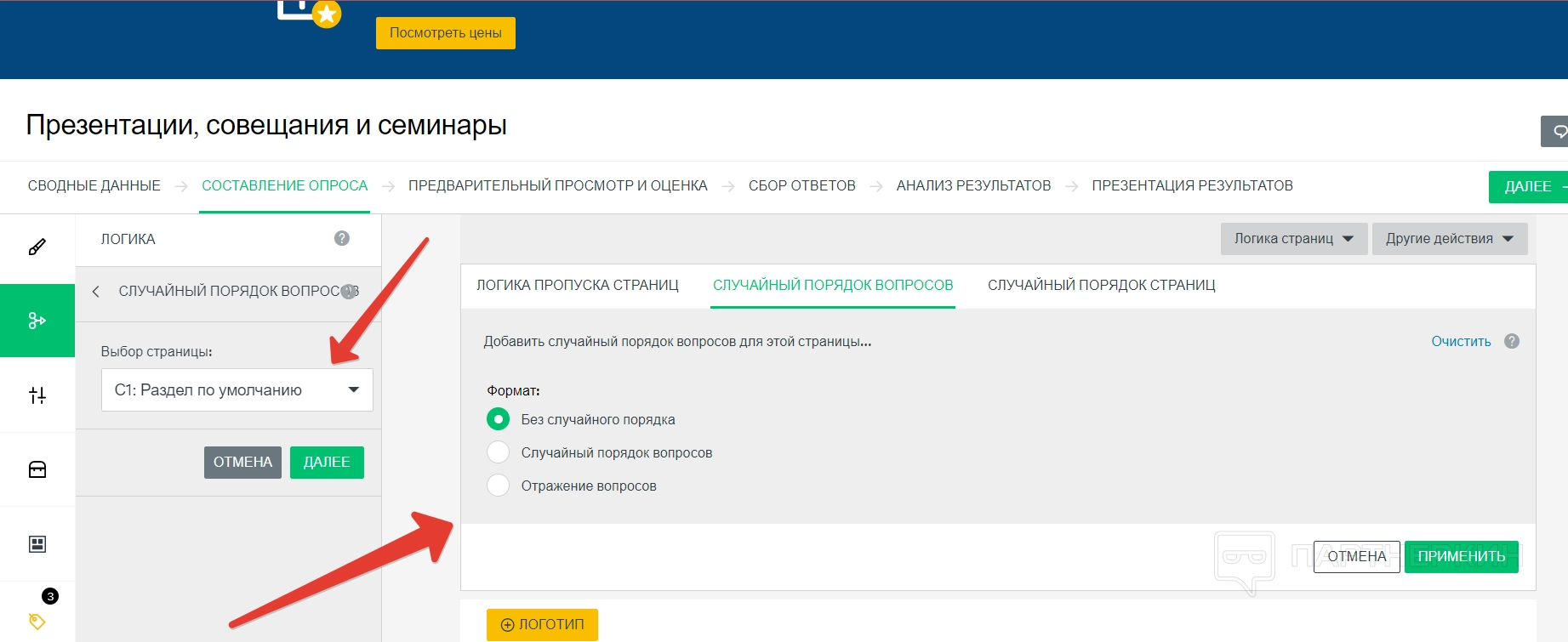 Случайный порядок страниц — данная функция позволяет сделать случайный или обратный порядок страниц, чтобы снизить риски системных ошибок отображения страниц. То есть пользователь после ответа на вопросы одной страницы будет попадать на рандомную или последнюю страницу из списка, в зависимости от настроек.