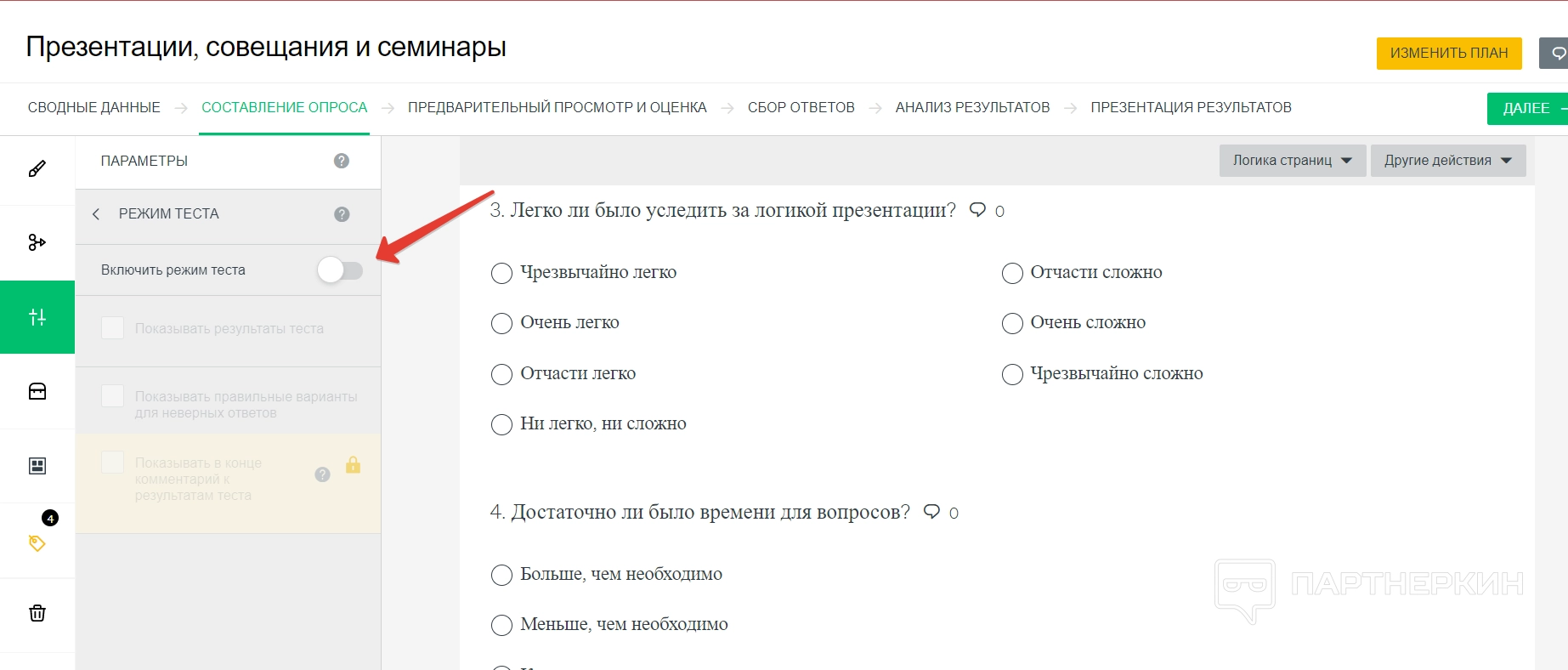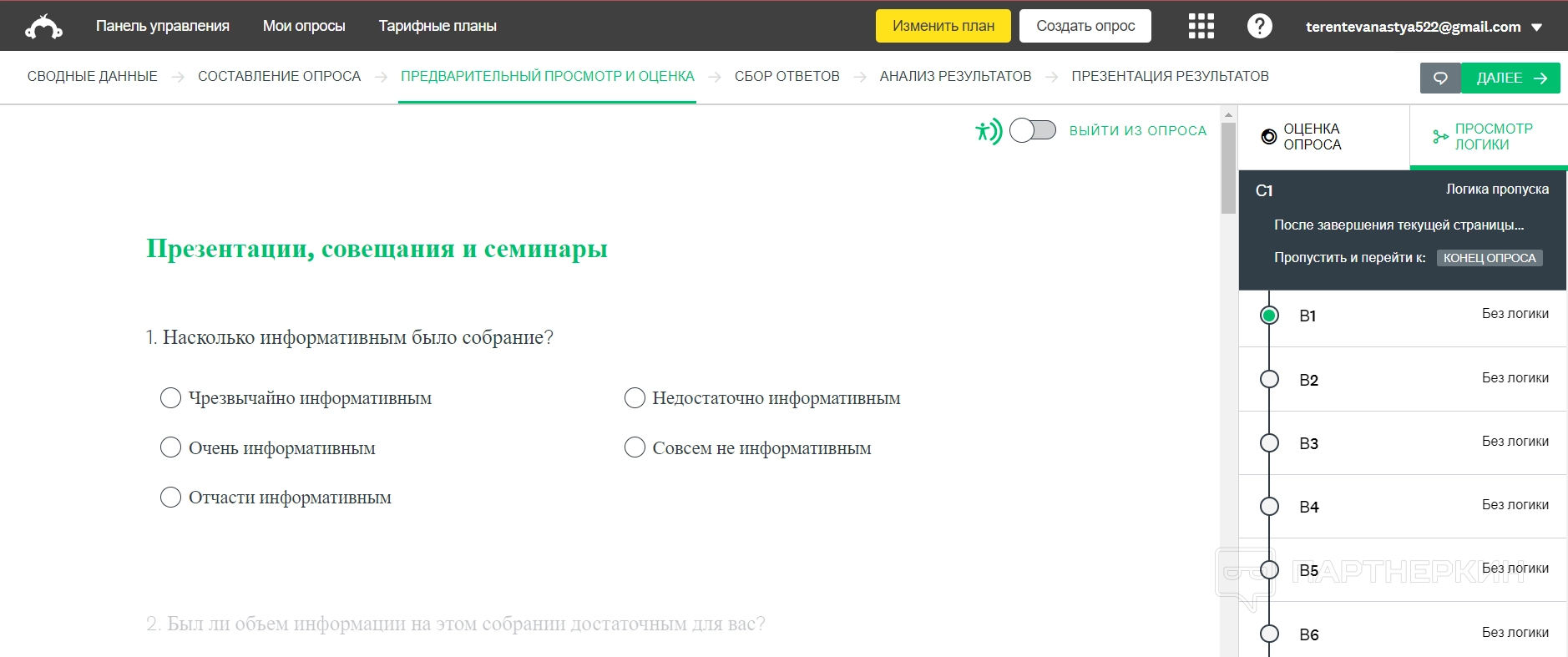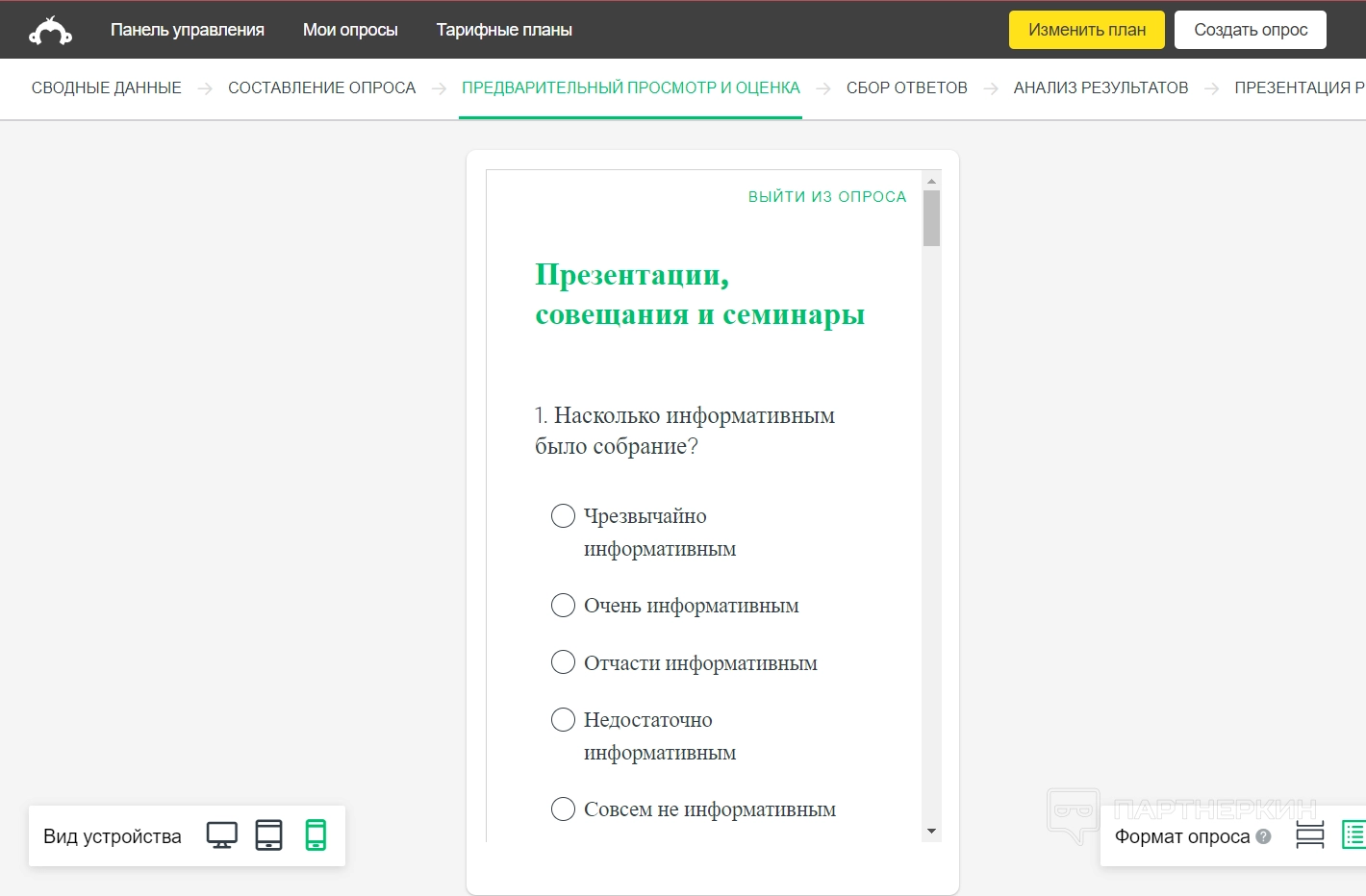 Предварительный просмотр и оценка — этот раздел предлагает посмотреть, как отображается весь опрос, и правильно ли работают ответы. Его можно также использовать в процессе подготовки опроса, чтобы смотреть, как работают те или иные элементы.