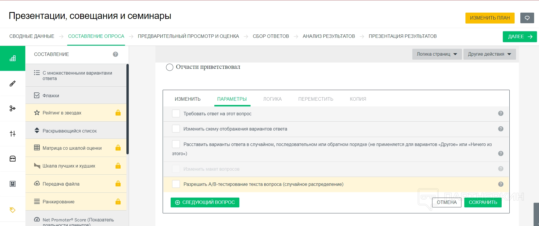 В параметрах указывается, нужно ли делать вопрос обязательным для ответа. Также можно изменить само расположение вариантов ответов, расставить ответы в рандомной порядке, изменить макет вопросов и разрешить A/B-тестирование текста вопроса.