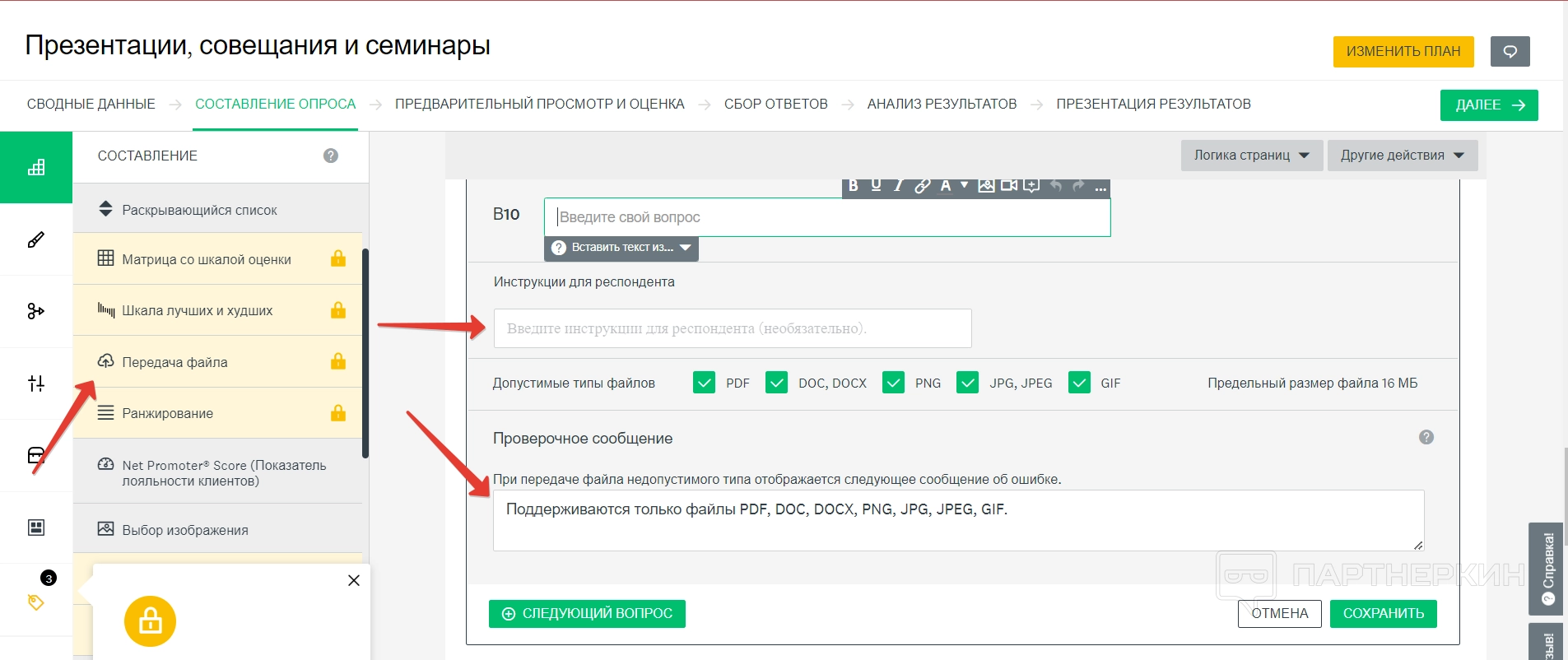 Передача файлов — этот вопрос дает возможность пользователь выгружать определенные файлы для ответа. В настройках можно отметить, какие типы файлов можно добавлять, а также добавить сообщение с предупреждением в случае ошибки.