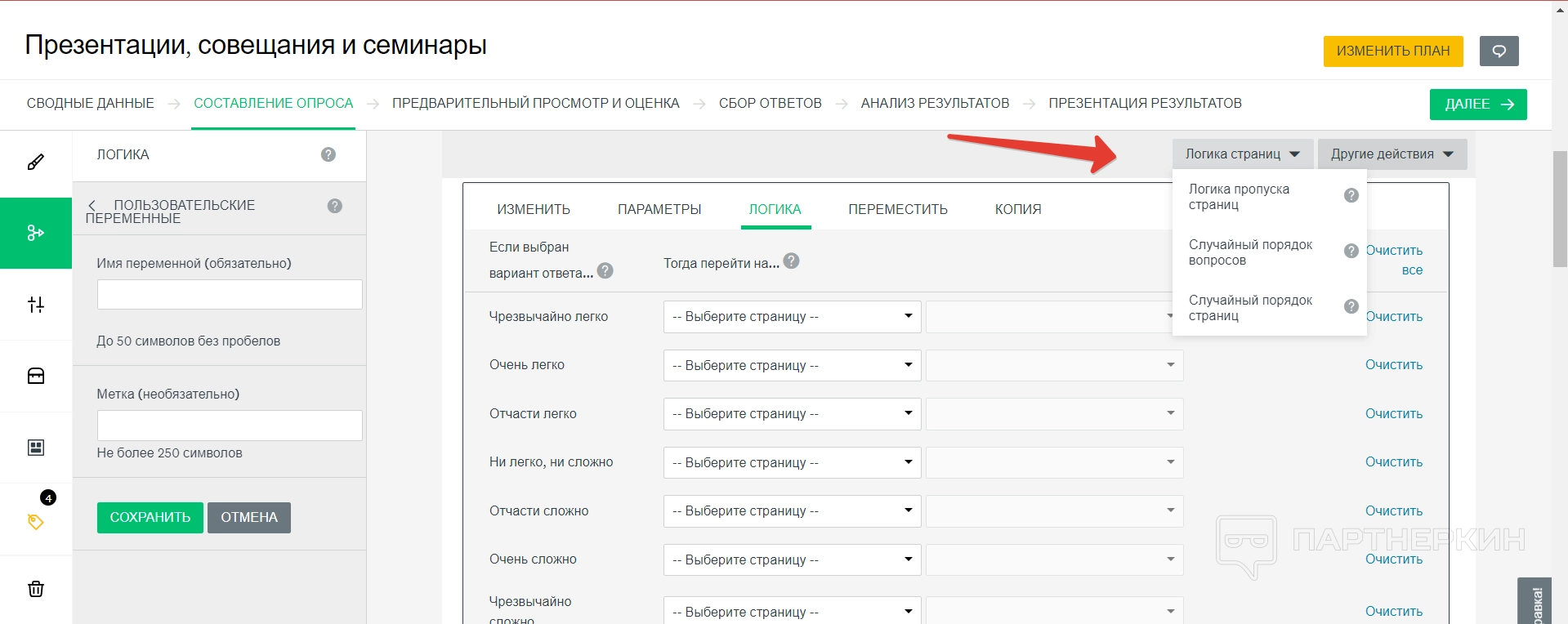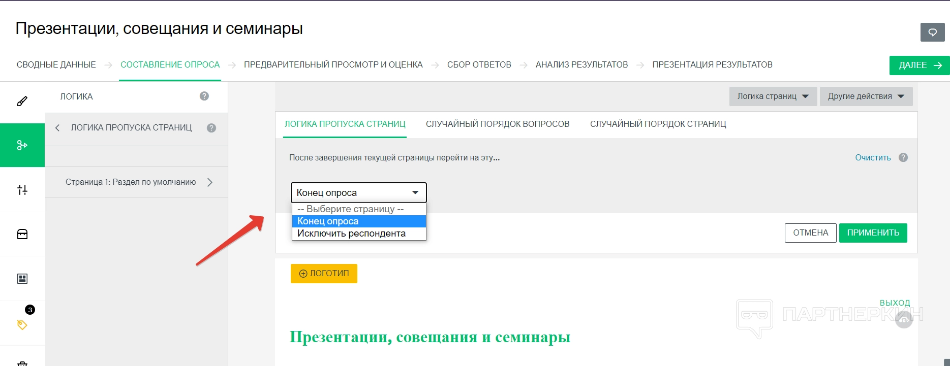 Логика пропуска страниц — в этом разделе можно обозначить, на какую страницу будет попадать пользователь после окончания предыдущей. Его можно направить сразу в конец опроса, исключить по необходимости, а также добавить новую страницу с другими вопросами. Для этого достаточно нажать на нужную функцию и выбрать страницу.
