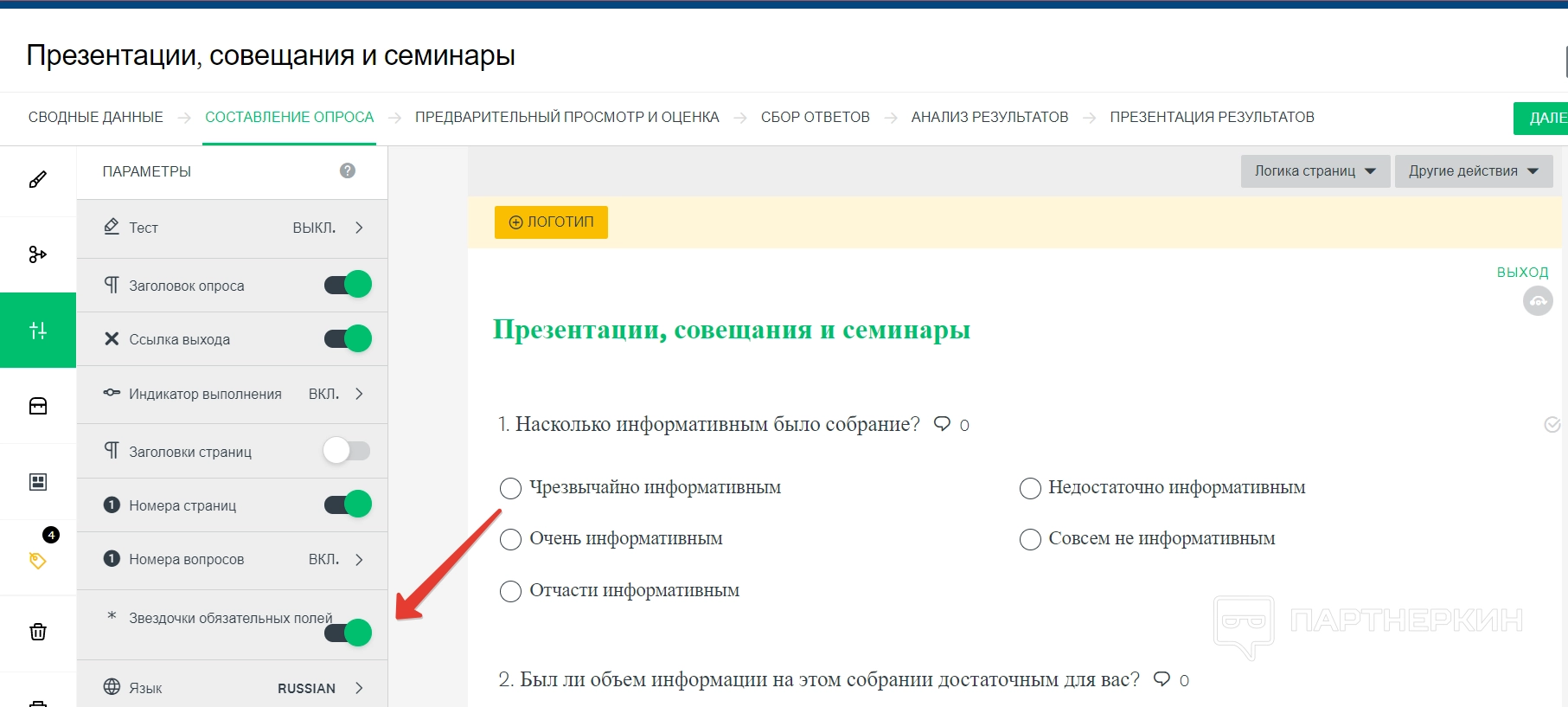 Звездочки обязательный полей — с помощью данной функции можно указать, будут ли отдельные поля, в которых обязательно нужно указать ответ, отмечаться звездочкой. Чтобы избавить респондентов от непонимания, лучше активировать эту функцию.