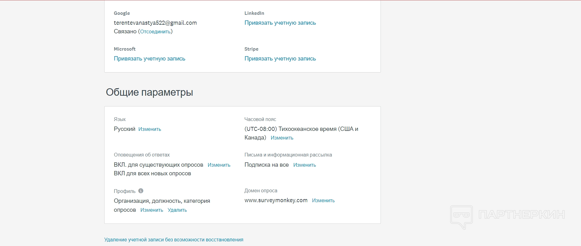 В общих параметрах в самом низу изменяются данные языка, настройки профиля, часового пояса, рассылок, домена опроса и включаются оповещения об ответах на них.