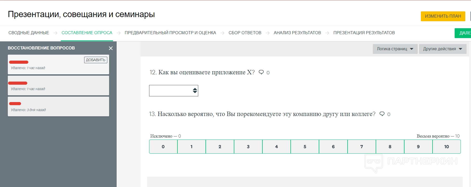 Пока происходит редактирование опроса, можно без проблем заходить в корзину и просматривать списки вопросов, которые пользователь удалял. При этом дается возможность их восстановить. Достаточно навести курсор на нужный вопрос и нажать на кнопку «Добавить».