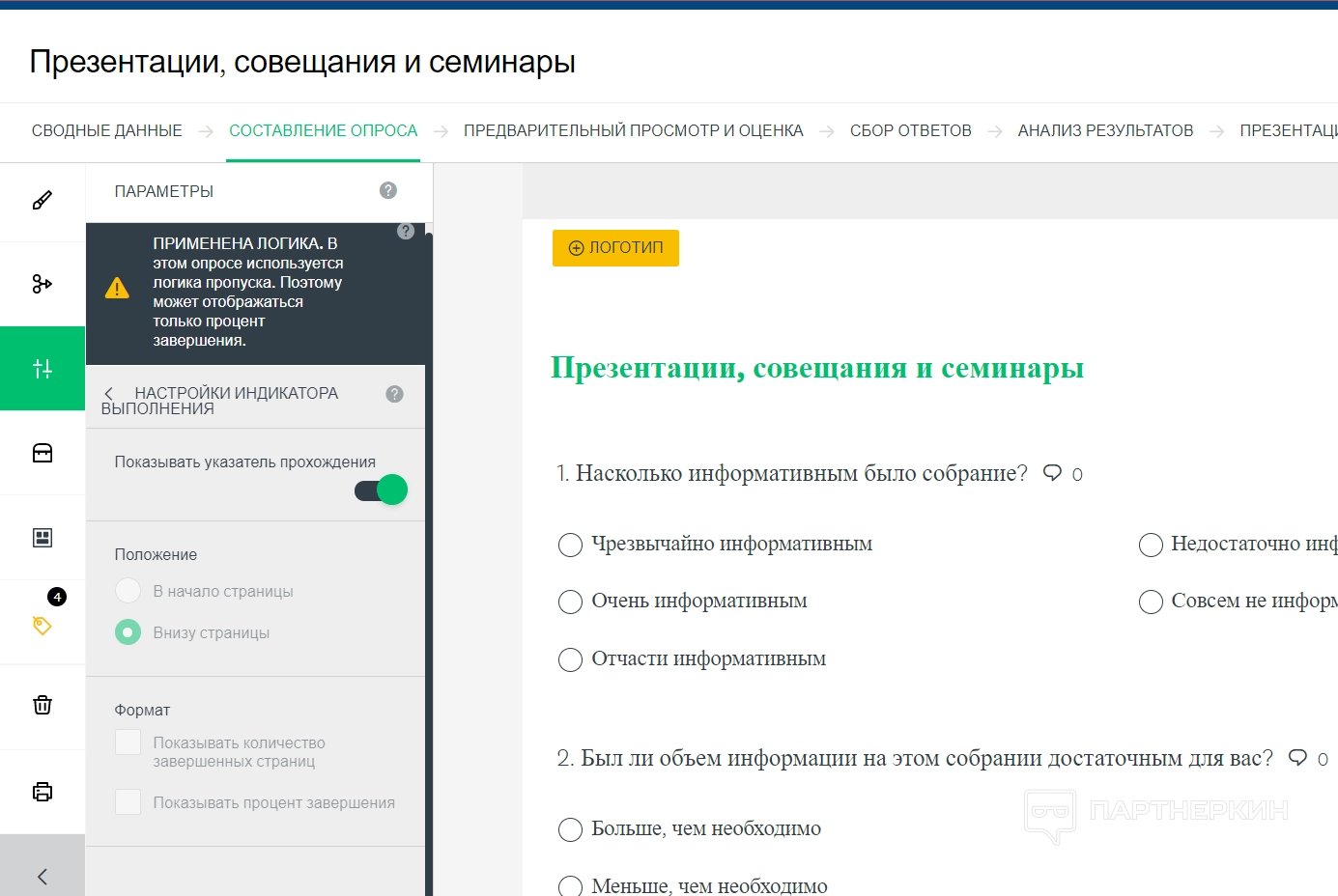 Индикатор выполнения — с помощью этой функции можно отключать или включать индикатор прохождения теста, то есть горизонтальную линию с прогрессом респондента. Многим удобно следить за тем, сколько ответов осталось дать, поэтому лучше функцию использовать по возможности. Кроме того, здесь задается расположение индикатора — вверху или внизу страницы — и формат отображения — количество может отображаться в количестве страниц или в процентах.