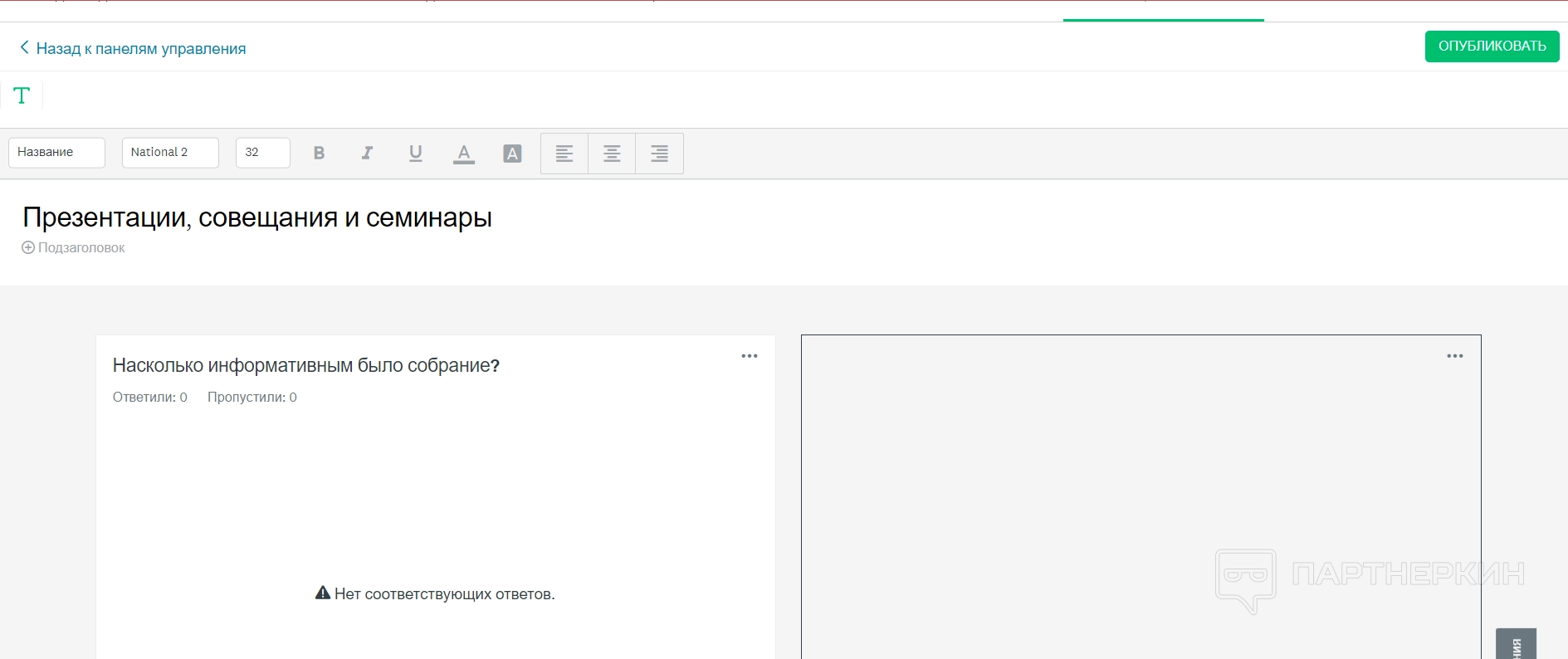 Презентация результатов — в этом разделе можно все данные опросов представлять в более интересном виде. Для этого придется подключить новую панель управления, если она не было добавлено. После этого все данные из отчета можно перегонять в нее и оформлять в формате дашбордов, например, чтобы представлять их на собрании не в виде сухих цифр.