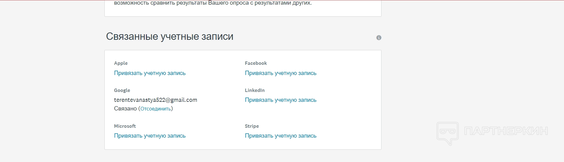 В личных настройках можно привязывать учетные записи других сервисом и платформ — доступно Apple, Google, Microsoft, Facebook*, LinkedIn и Stripe.