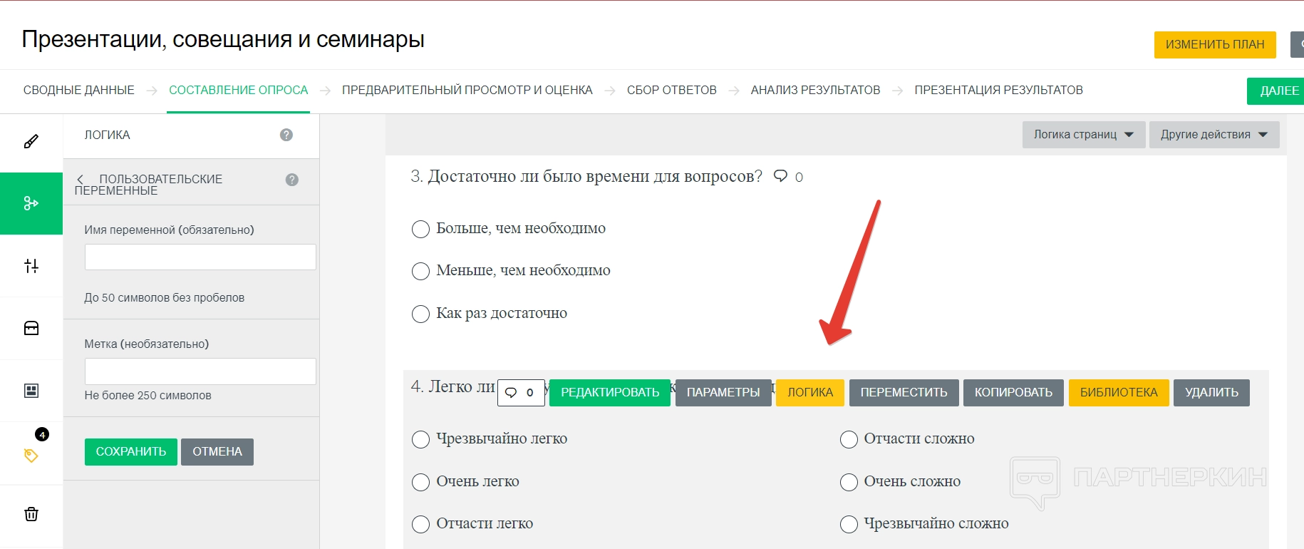 Это все функции, которые есть в разделе с управлением логикой. Но примечательно и то, что логика может настраиваться для каждого вопроса индивидуально. Достаточно навести на нужный вопрос курсор и перейти в необходимые настройки.