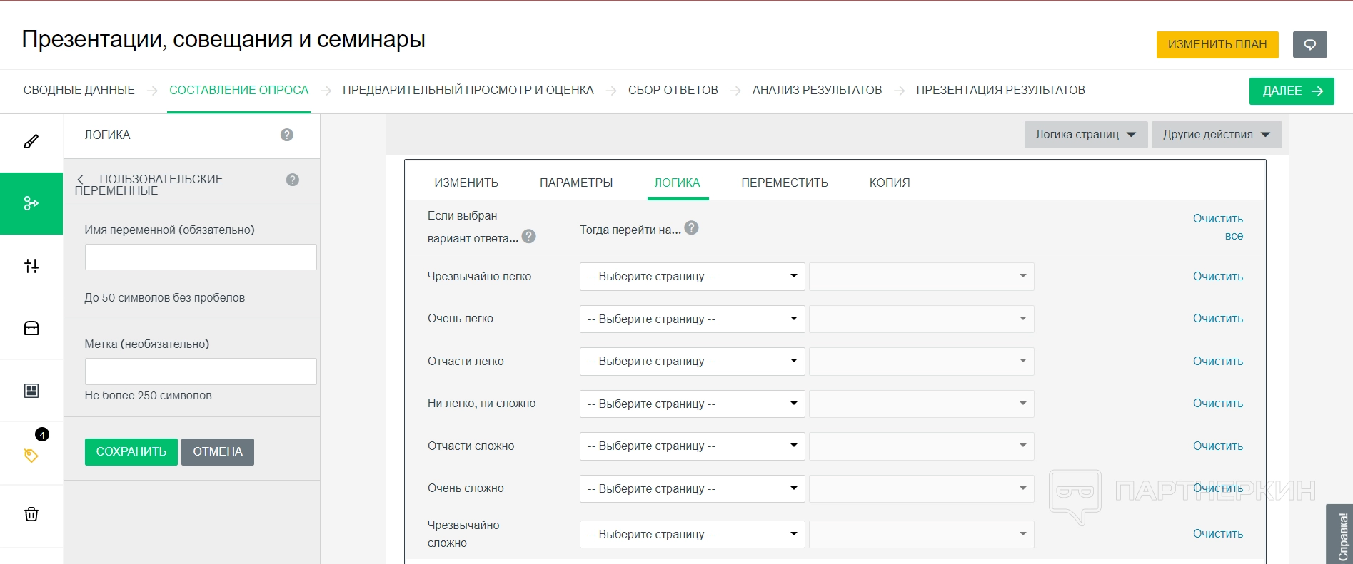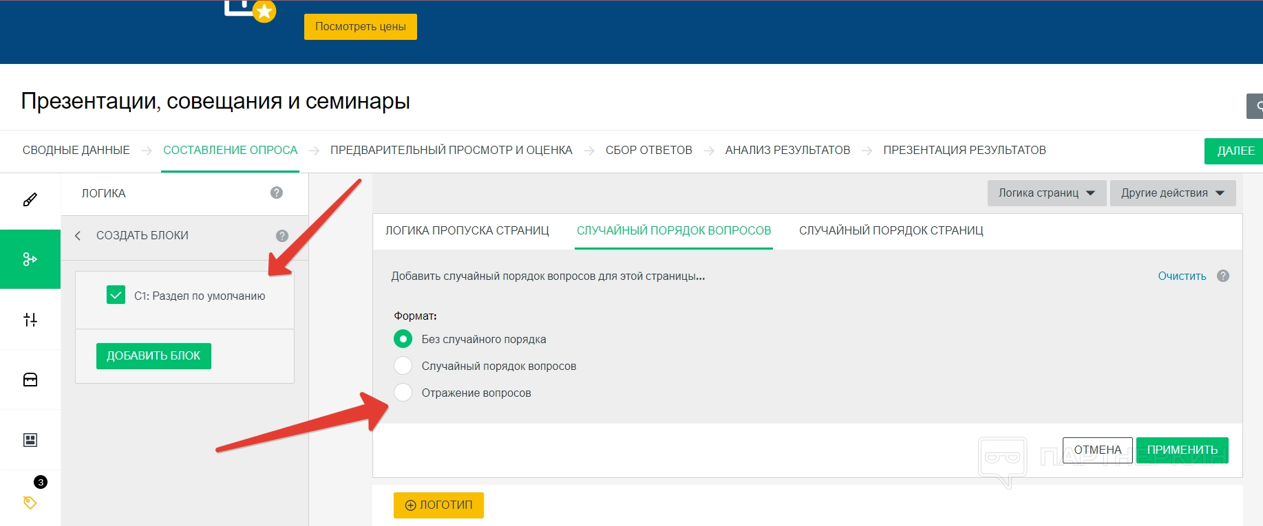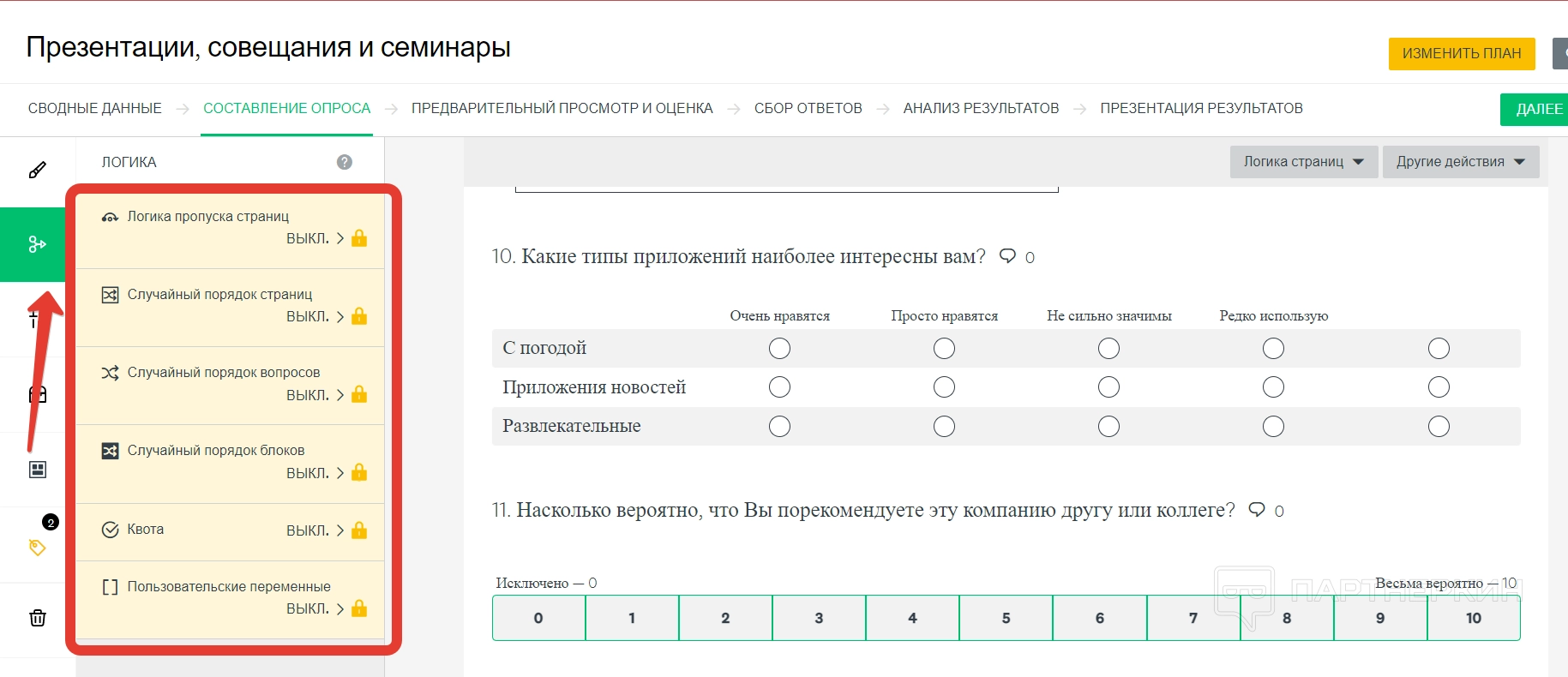 Этот раздел является полностью платным, и он может быть действительно полезным для сбора ответов респондентов. С его помощью можно управлять логикой пользователей — например, на основе определенных ответов выдавать им конкретные вопросы по контексту, а не просто все из списка. Рассмотрим все функции в этом разделе подробнее.