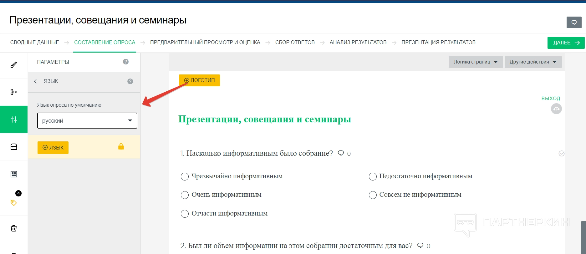 Язык — здесь определяется язык всего опроса, чтобы не возникло проблем с отображением определенных символов и слов. По необходимости можно добавлять новые языки, если не хватает перечисленных в списке.