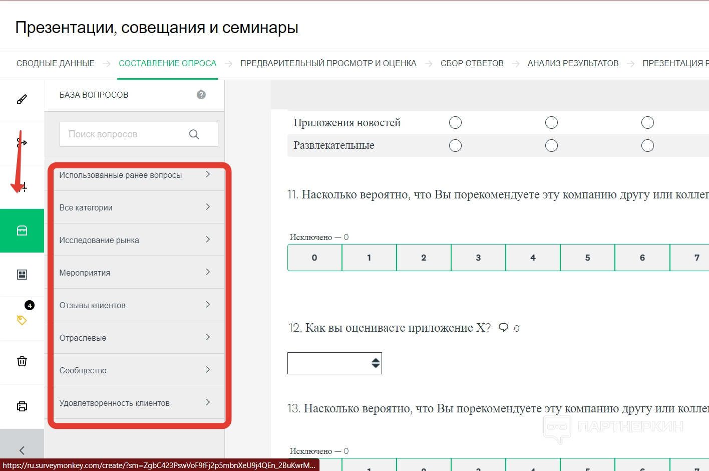 | Большая база вопросов — можно формулировать вопросы при помощью ключевых фраз, что ускоряет процесс создания опроса. | Небольшой функционал базовой версии — придется использовать только доступные варианты вопросов для работы, а также не будет доступа к экспорту анализа во многих нужных форматах. |