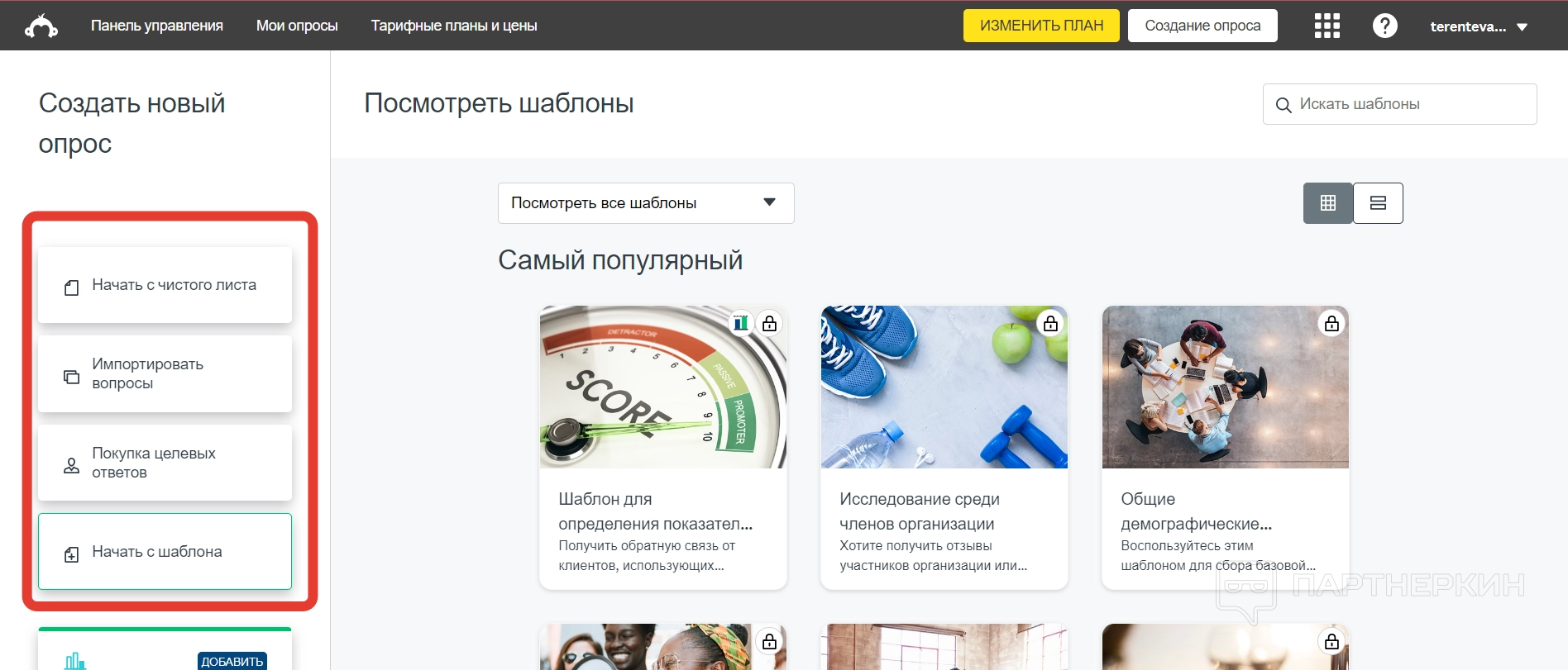 После этого перед пользователем открывается рабочее пространство — тут можно начать создание опроса с чистого листа или подобрать необходимый шаблон. При этом также предлагается импортировать все вопросы для опроса и приобрести целевые ответы.