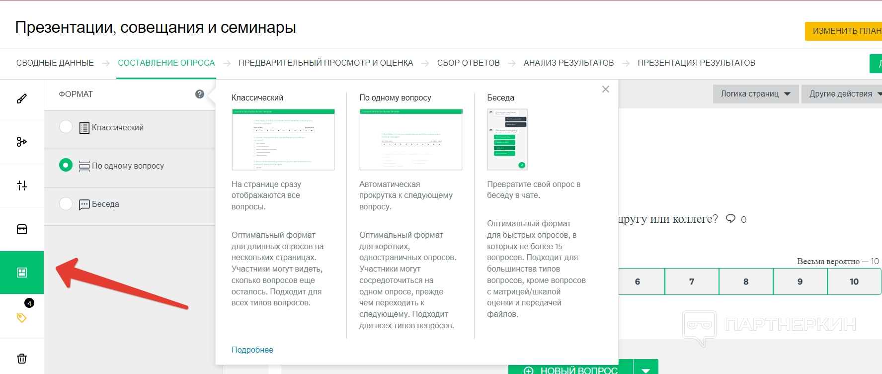 Этот раздел помогает выбрать формат для своего опроса. В случае с нашим шаблоном вопросы отображаются по одном — то есть пользователь отвечает на один вопрос и не видит остальные, так как они будут показывать только при скролле вниз.