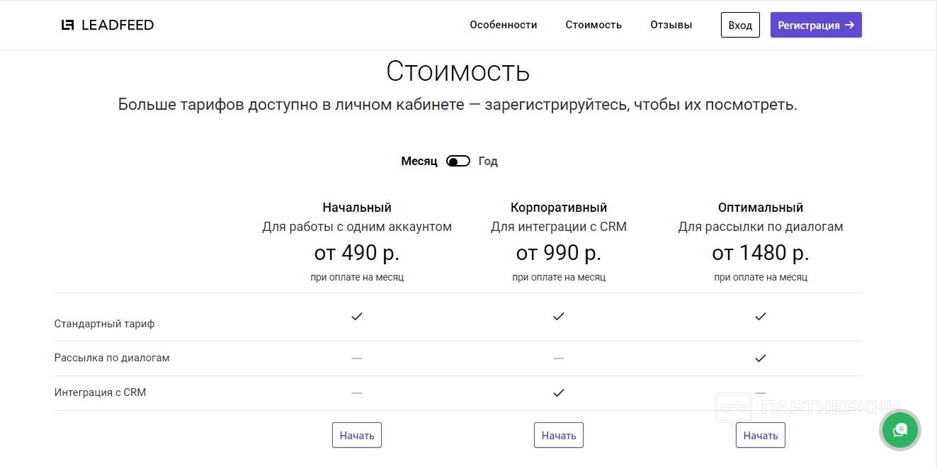- Начальный . 490 ₽/месяц, при оплате на год – 294 ₽/месяц. Включает в себя работу с одним аккаунтом и стандартные опции без возможности рассылки по диалогам.