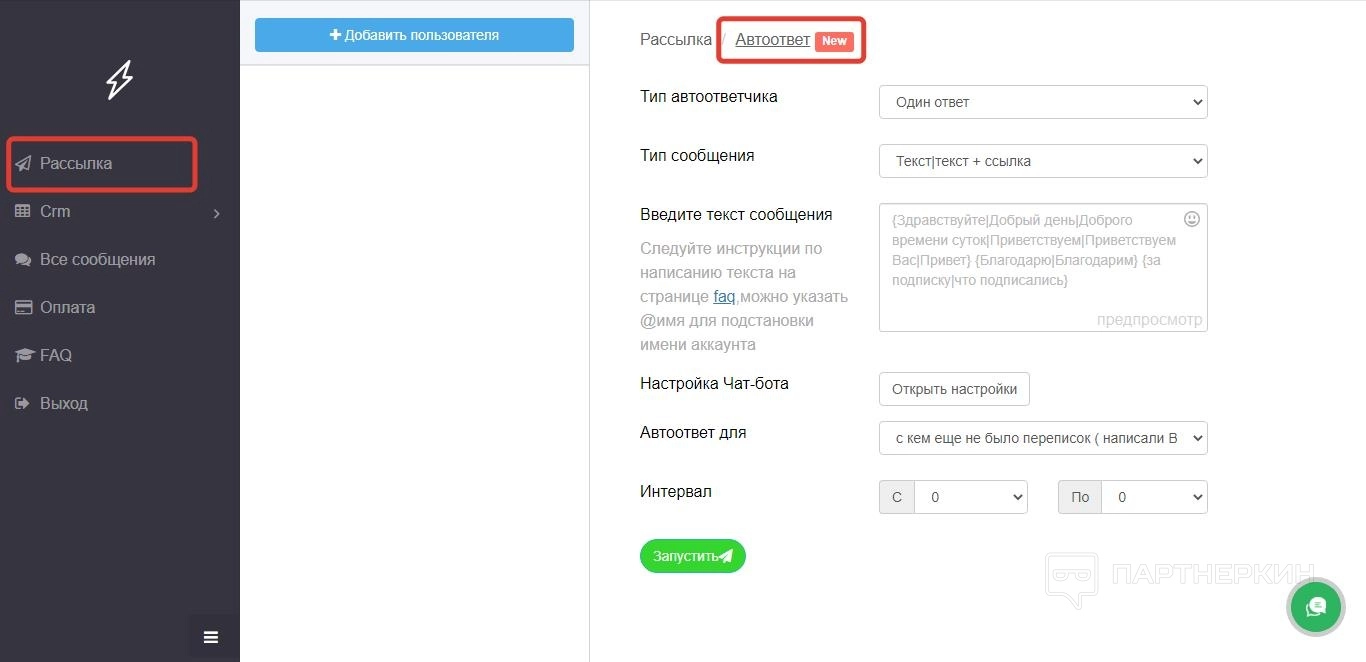 - Рассылка . В этом разделе формируются рассылки и автоответы.