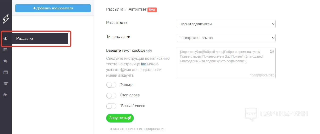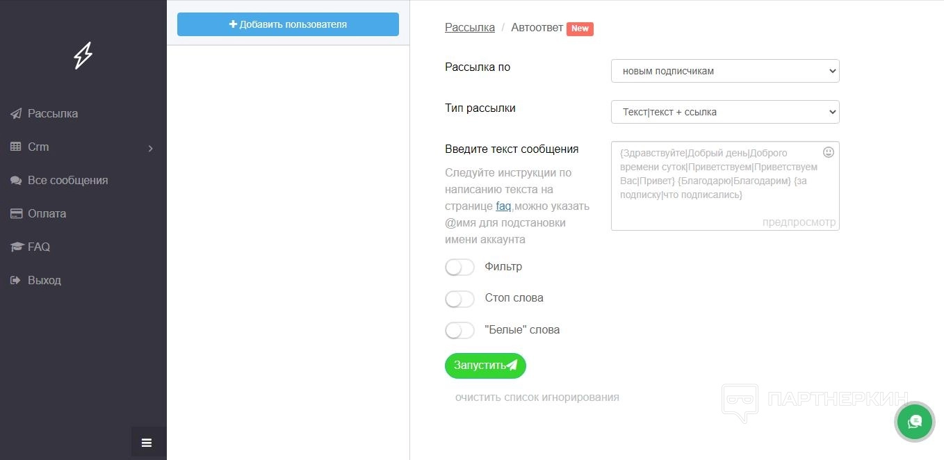 При настройке рассылки по всем подписчикам можно игнорировать пользователей, с которыми уже был начат диалог. Дополнительно также можно указывать стоп-слова и белые слова. Когда все будет готово, нажмите «Запустить».