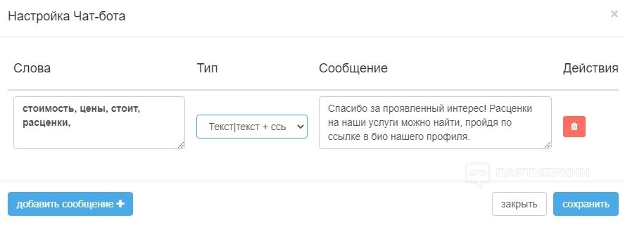 - Триггерные слова – после упоминания каких слов будет отсылаться выбранное сообщение. Можно оставить пустым, тогда созданное письмо будет отсылаться в ответ на любые обращения.