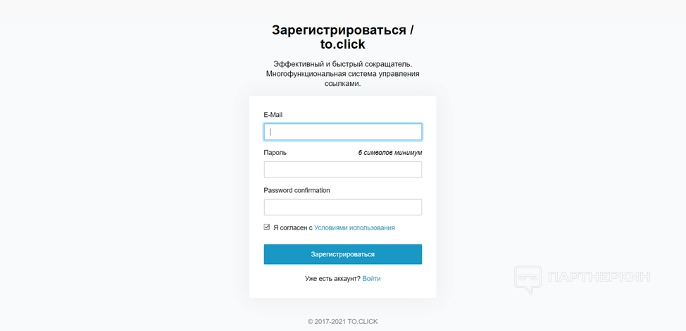 - Вас перебросит на форму регистрации. Введите свой email, придумайте пароль и согласитесь с условиями использования. Нажмите на кнопку «Зарегистрироваться».