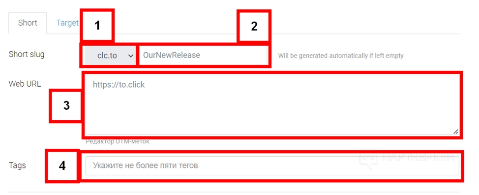 - Укажите публикацию (2). Если поле оставить пустым, ссылка будет сгенерирована автоматически.