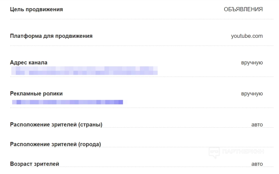 Там дают на выбор четыре инструмента — параметры, статистика, переименование, удаление. При переходе в параметры пользователь смотрет посмотреть всю сводную информацию по кампании — цель продвижения, ссылка на канал или видео, платформа, описание ЦА и бюджет.