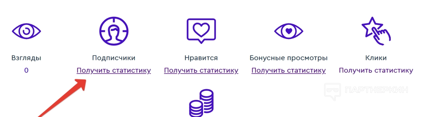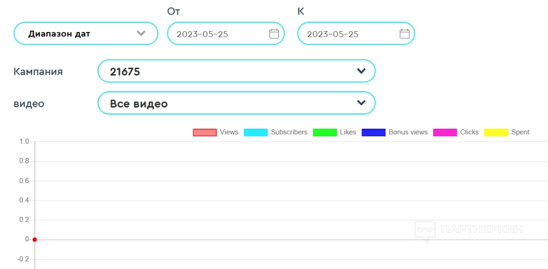 Пункт со статистикой позволяет посмотреть аналитические данные по конкретному ролику или каналу — там есть график, который показывает общий прирост просмотров, подписчиков, лайков, бонусных просмотров, кликов и затрат.