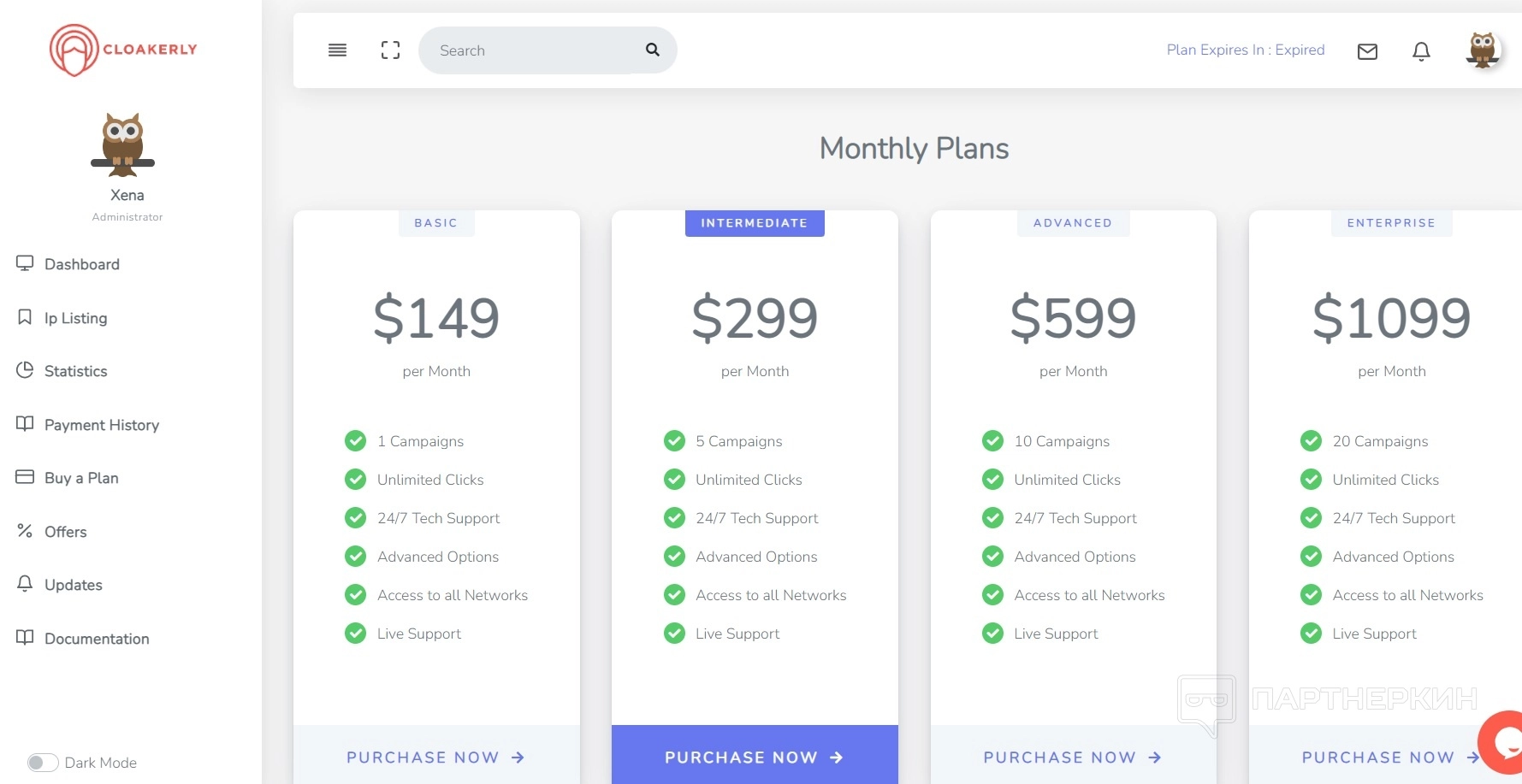 Другие тарифы с ежемесячной абонентской платой подходят опытным арбитражникам и командам: Тариф «Средний» стоит $299 в месяц поддерживает 5 кампаний, передовой тариф за $599 в месяц поддерживает 10 кампаний. Самый дорогой тариф «Предприятие» за $1 099 в месяц подходит, чтобы вести 20 кампаний.