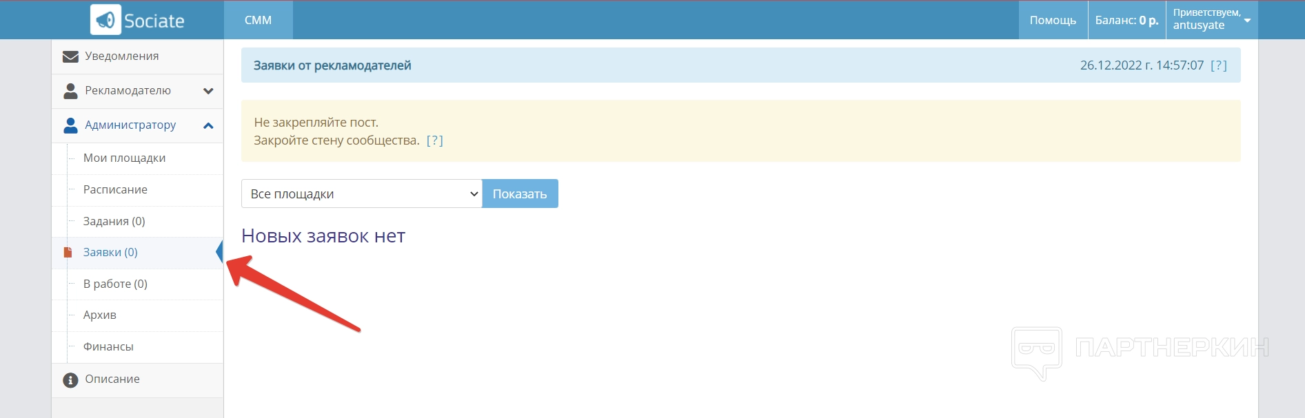 Заявки — здесь можно найти все заявки, которые администратору отправили рекламодатели.