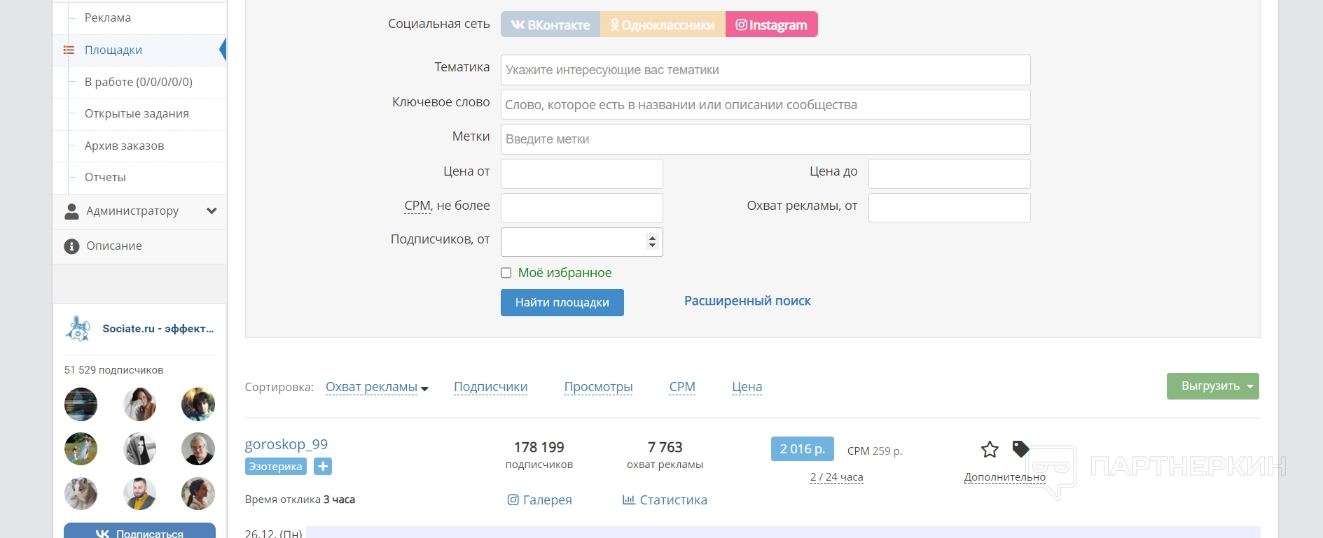 Площадки — в этом разделе можно искать полноценные аккаунты блогеров или брендов, которые запускают рекламу. Для более удобного поиска можно использовать фильтр — в нем указываются данные о социальной сети, тематике, ключевых словах, метках, ценах, охватах, CPM и подписчиках.