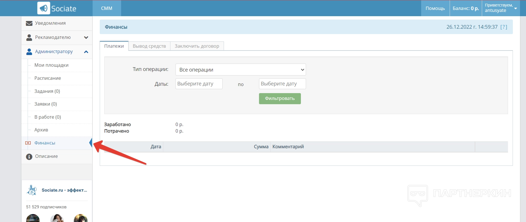 Отчеты — тут отображаются данные по всем заданиям по аналогии кабинета для рекламодателей. Кроме того, в этом разделе можно вывести средства, а также заключить договор с сервисом, чтобы производить выводы по безналичному расчету.