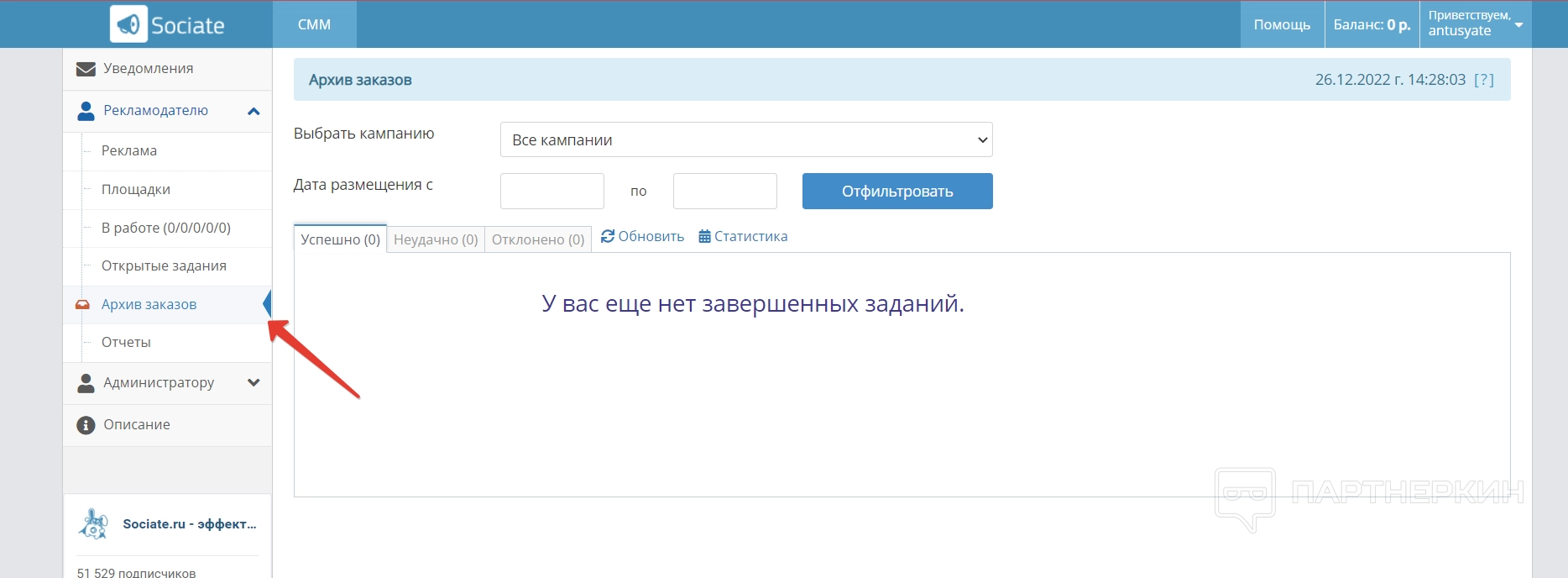 Архив заказов — с помощью этого раздела можно посмотреть все заказы, которые создавал пользователь, даже если они уже исполнены. В списке они разделены на те, что исполнили, и на те, которые отклонили, или они были неудачны.