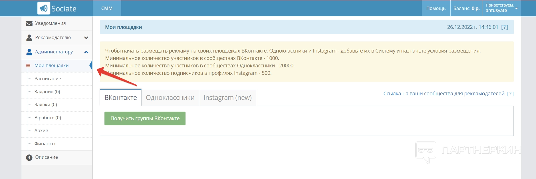 Площадки — в разделе можно добавлять свои площадки, в которых планируется размещение рекламы. Только важно почитать, какие лимиты у сообществ — например, у сообщества Вконтакте должно быть не менее 1000 подписчиков.