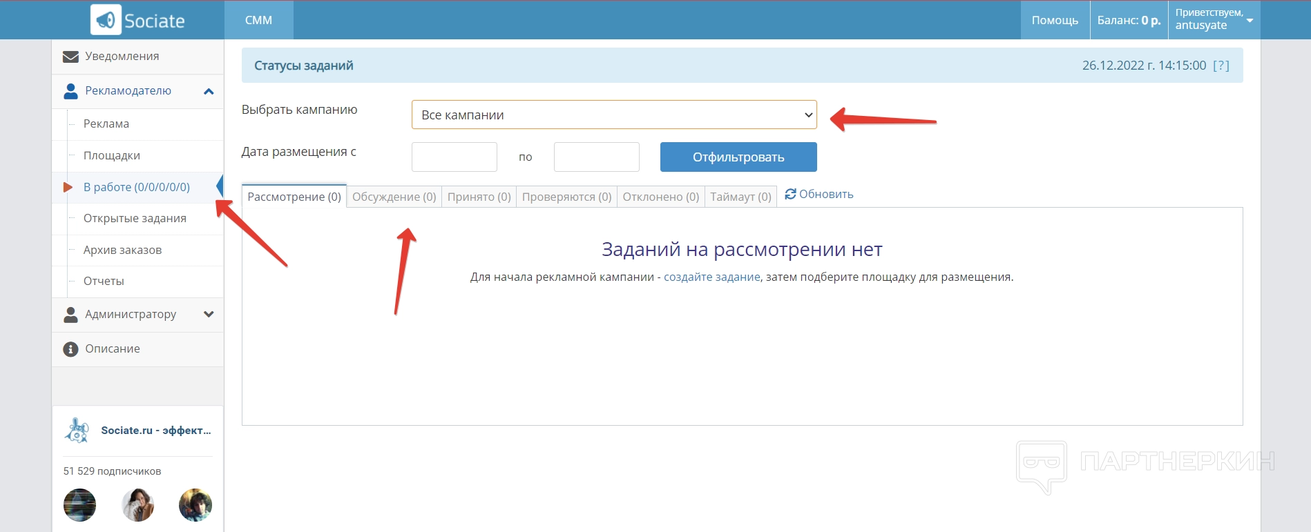 В работе — в этом разделе показываются все задания, которые создал рекламодатель. Для удобного просмотра список разделили на несколько — рассмотрение, обсуждение, принято, проверяются и так далее. В фильтре можно отметить рекламную кампанию, которой принадлежат нужные задания.