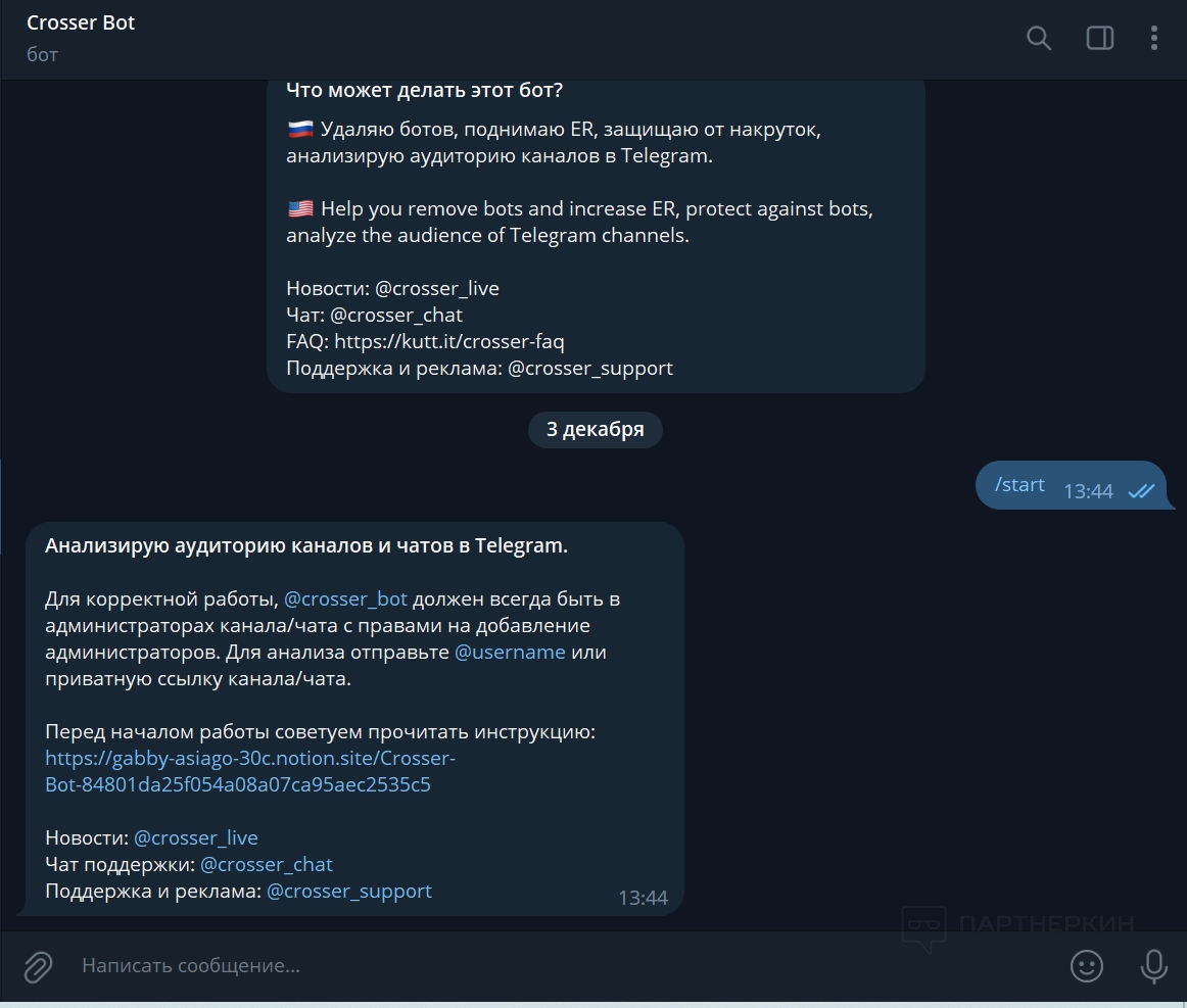 crosser botимеется достаточное количество каналов, которые постоянно пополняют свою базу по рекламным площадкам, то есть, пользователь получит доступ к эффективности по притоку пользователей от рекламы внутри других каналов и по конкурентным группам.