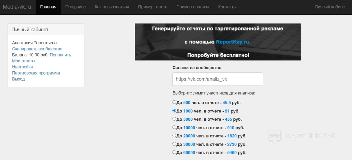 В процессе работы с сервисом необходимо указать саму ссылку на сообщество пользователя или конкурента, после чего выбрать анализ какого количества подписчиков необходимо произвести. Данные по итогу будут предоставлены в формате таблицы.