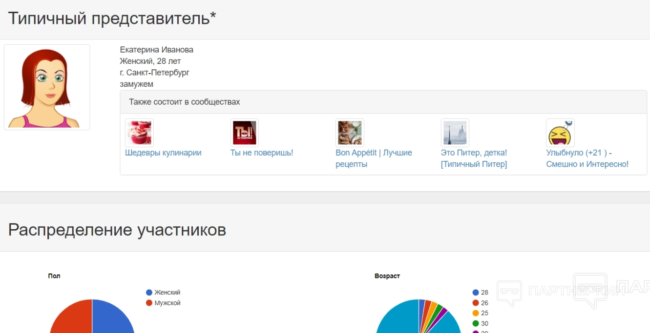По итогу анализа пользователи могут просматривать данные об аудитории — в отчете показывается общий портрет среднестатистического пользователя, а также распределение подписчиков по полу, возрасту, семейному положению и городам. Также подбивается топ пабликов, на которые подписаны юзеры сообщества.