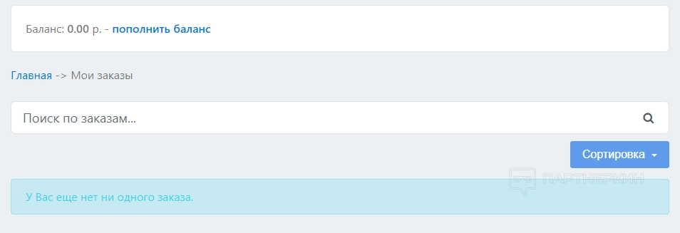 Также заказы можно найти через поиск. В нашем примере нет ни одного заказа.