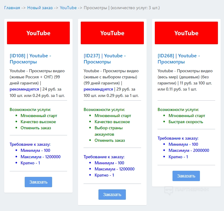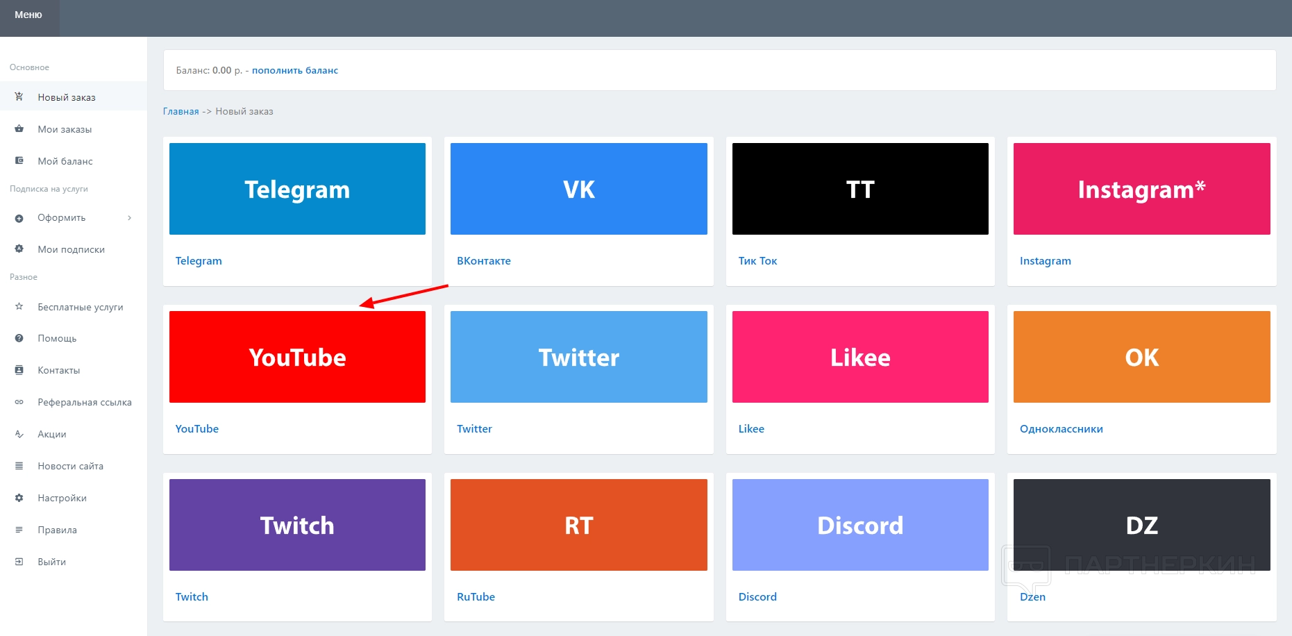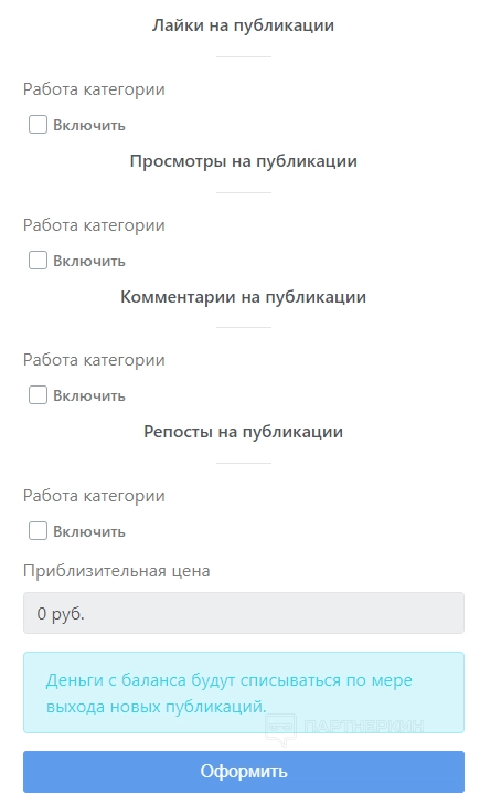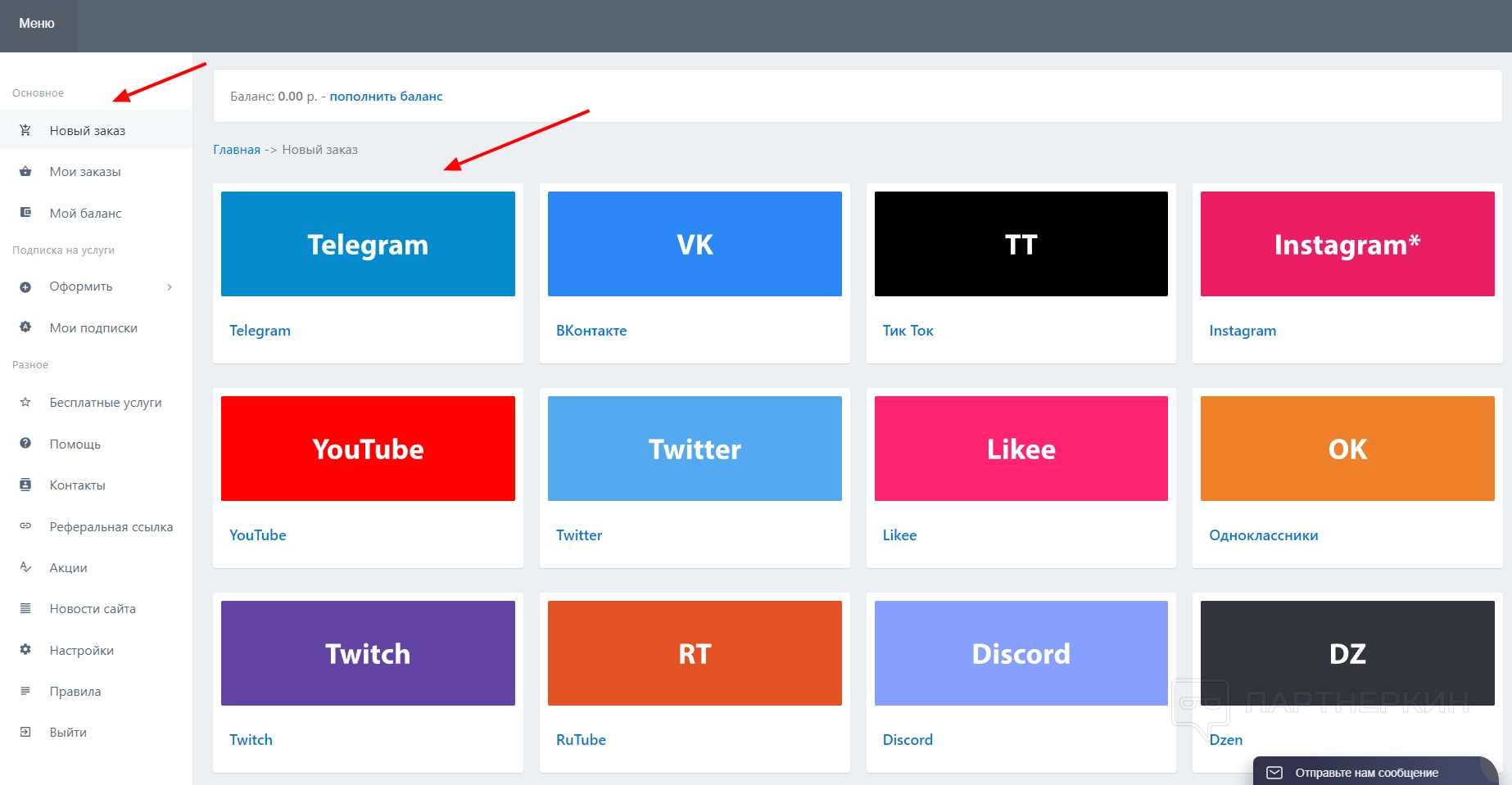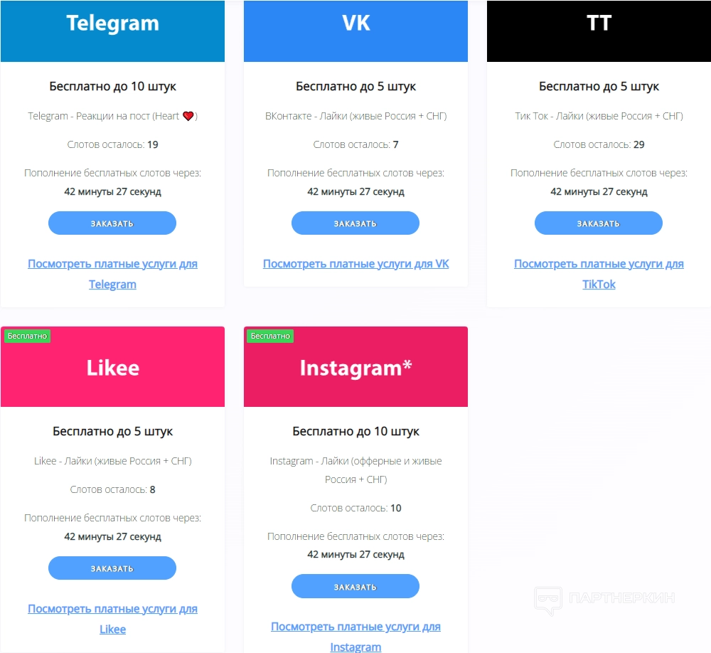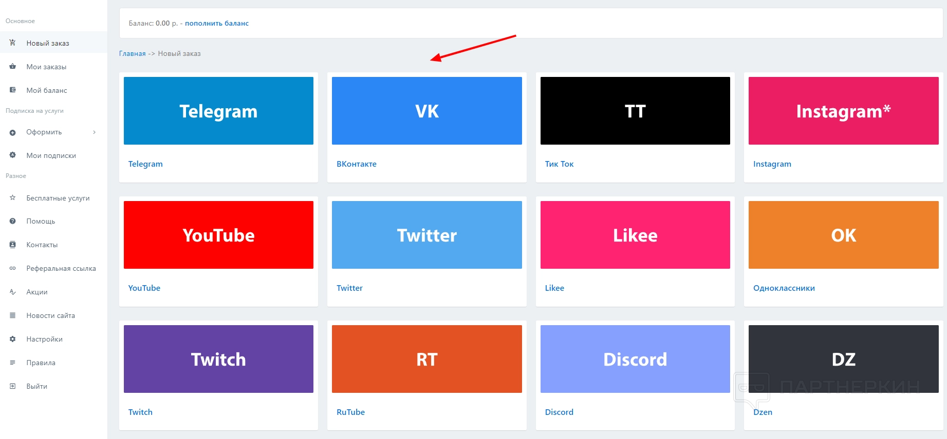 Примечание : оформление услуг для других социальных сетей и площадок проходит аналогично. Не будем подробно останавливаться на этом. Подробно рассмотрим разделы из личного кабинета пользователя.