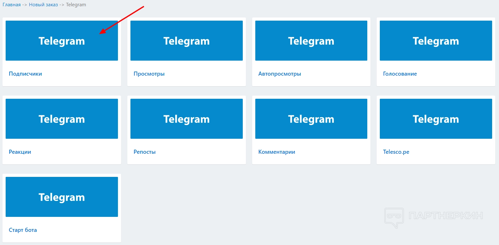 - Указать тип услуги. Для Telegram доступны: подписчики, просмотры, автопросмотры, голосование, реакции, репосты, комментарии, telesco.pe, старт бота. Для теста выберем накрутку подписчиков.