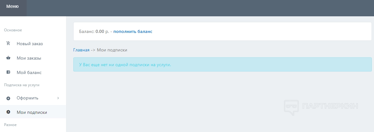 В этом разделе отображаются все купленные подписки на услуги. Мы их не покупали, поэтому страница пустая.