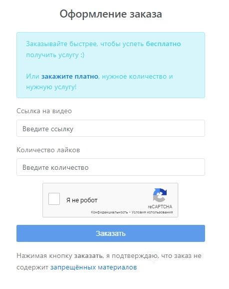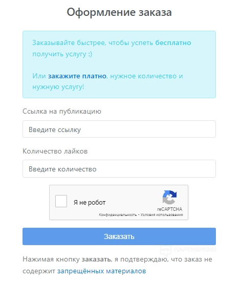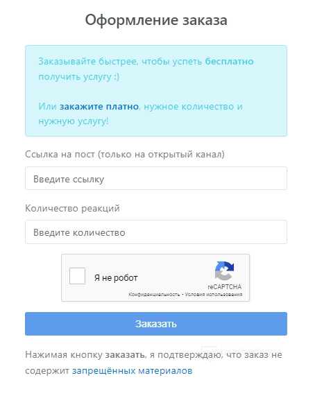Сервис предлагает накрутить до 10 лайков на пост. Для оформления этой услуги необходимо ввести ссылку на пост (только на открытый канал) и указать количество реакций.